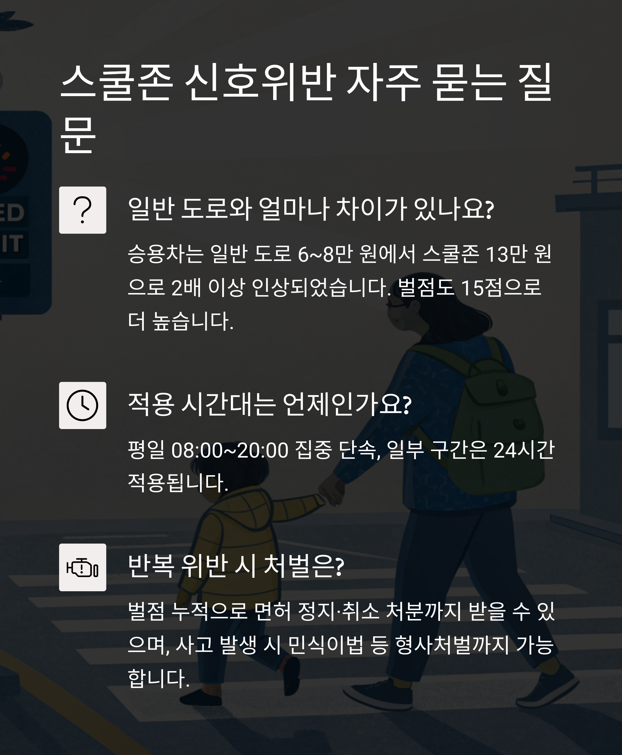 - 신호위반 시 15점 부과 (일반도로는 10~15점, 스쿨존은 상한 적용)