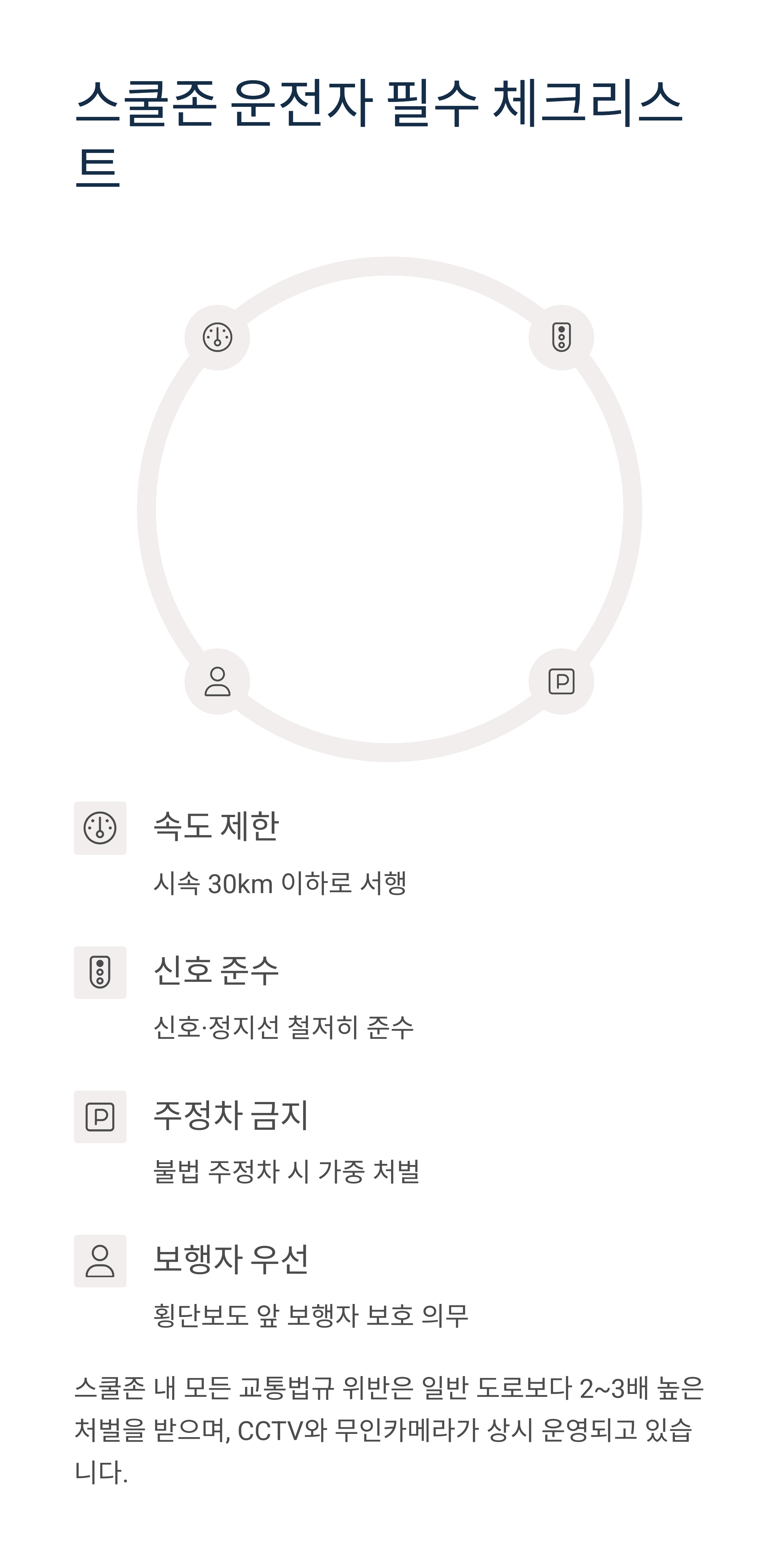 - 스쿨존 내에서는 반드시 시속 30km 이하, 신호·정지선 준수, 보행자 우선 양보