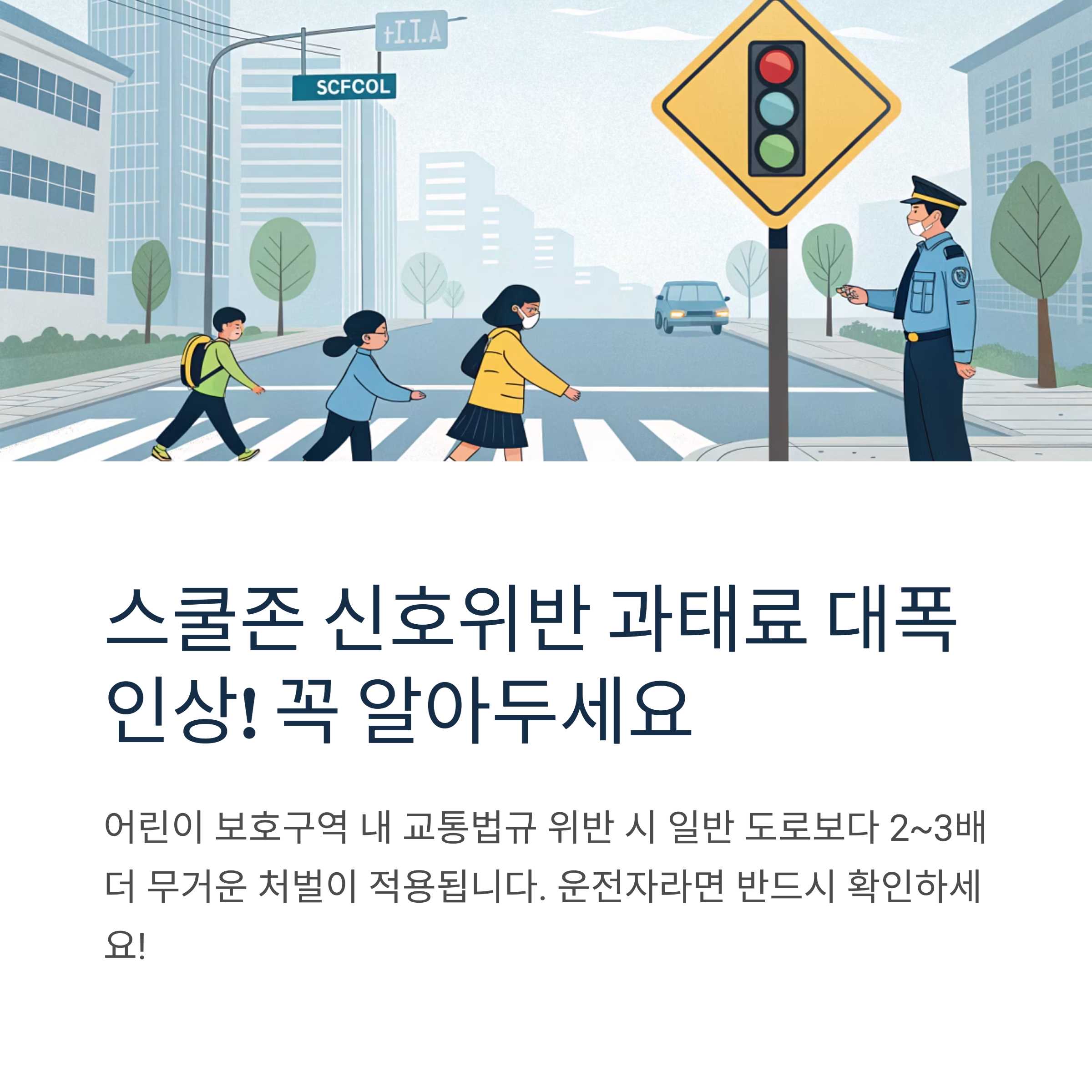 2025년부터 어린이 보호구역(스쿨존) 내 신호위반에 대한 과태료와 범칙금, 벌점이 대폭 인상되어 적용되고 있습니다. 어린이 교통사고 예방과 안전한 통학로 조성을 위해 일반 도로보다 2~3배 더 무거운 처벌이 이루어지니, 운전자라면 반드시 교통법규를 지켜야 합니다. 아래에서 2025년 최신 기준 어린이 보호구역 신호위반 과태료, 범칙금, 벌점, 주의사항까지 상세히 정리합니다.