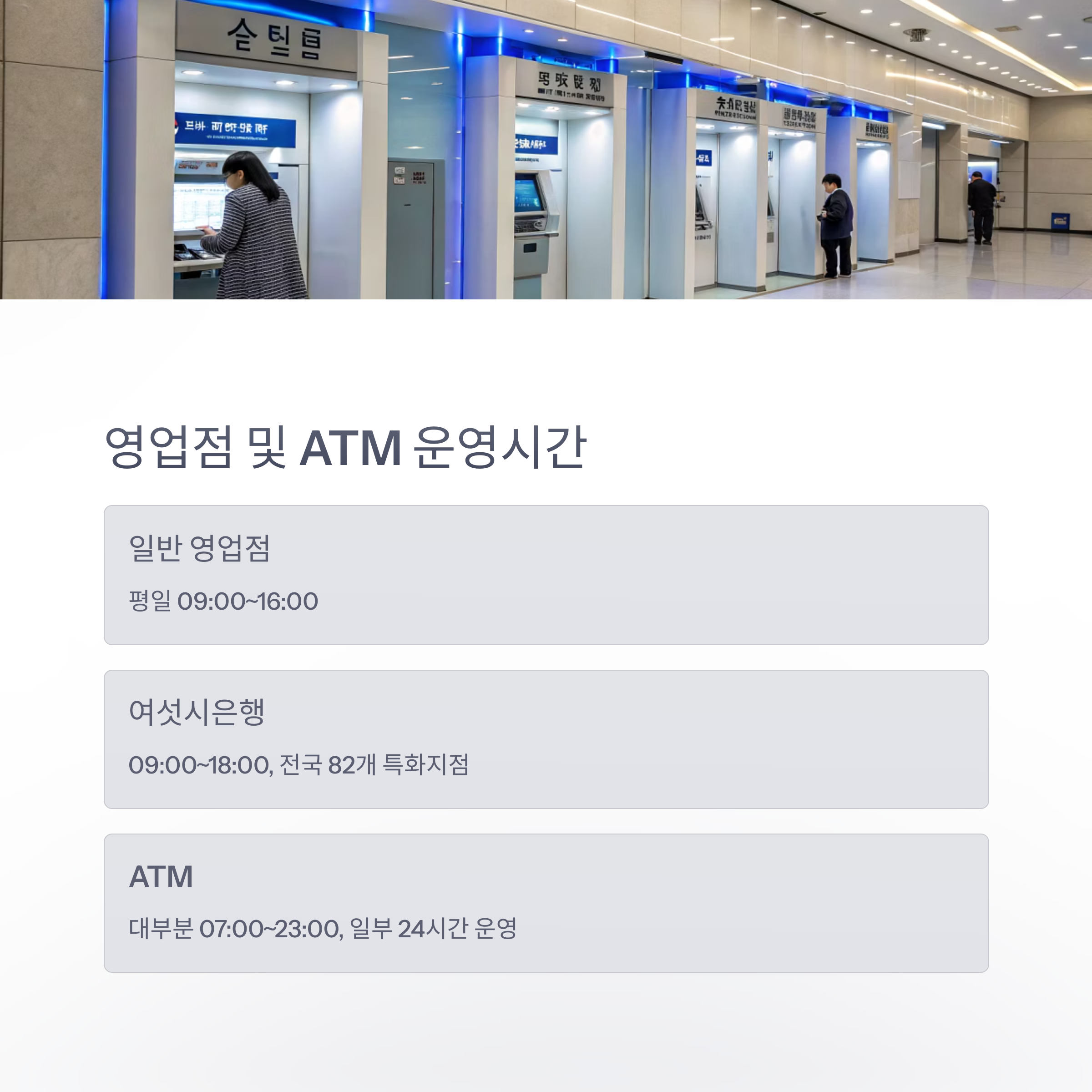 - ATM: 대부분 07:00~23:00, 일부 24시간 운영(공항·역사 등)