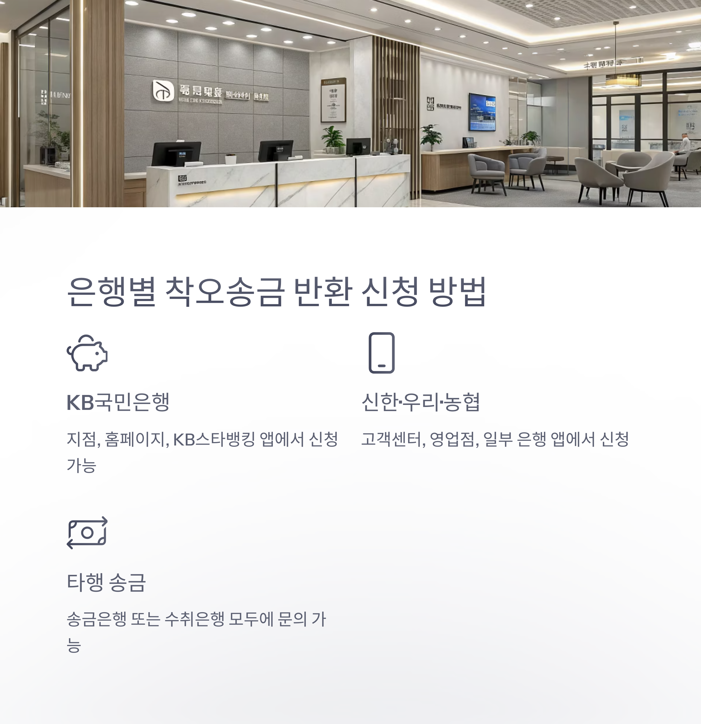 - KB국민은행: 지점 방문, 홈페이지, KB스타뱅킹 앱에서 ‘착오송금 반환’ 신청 가능