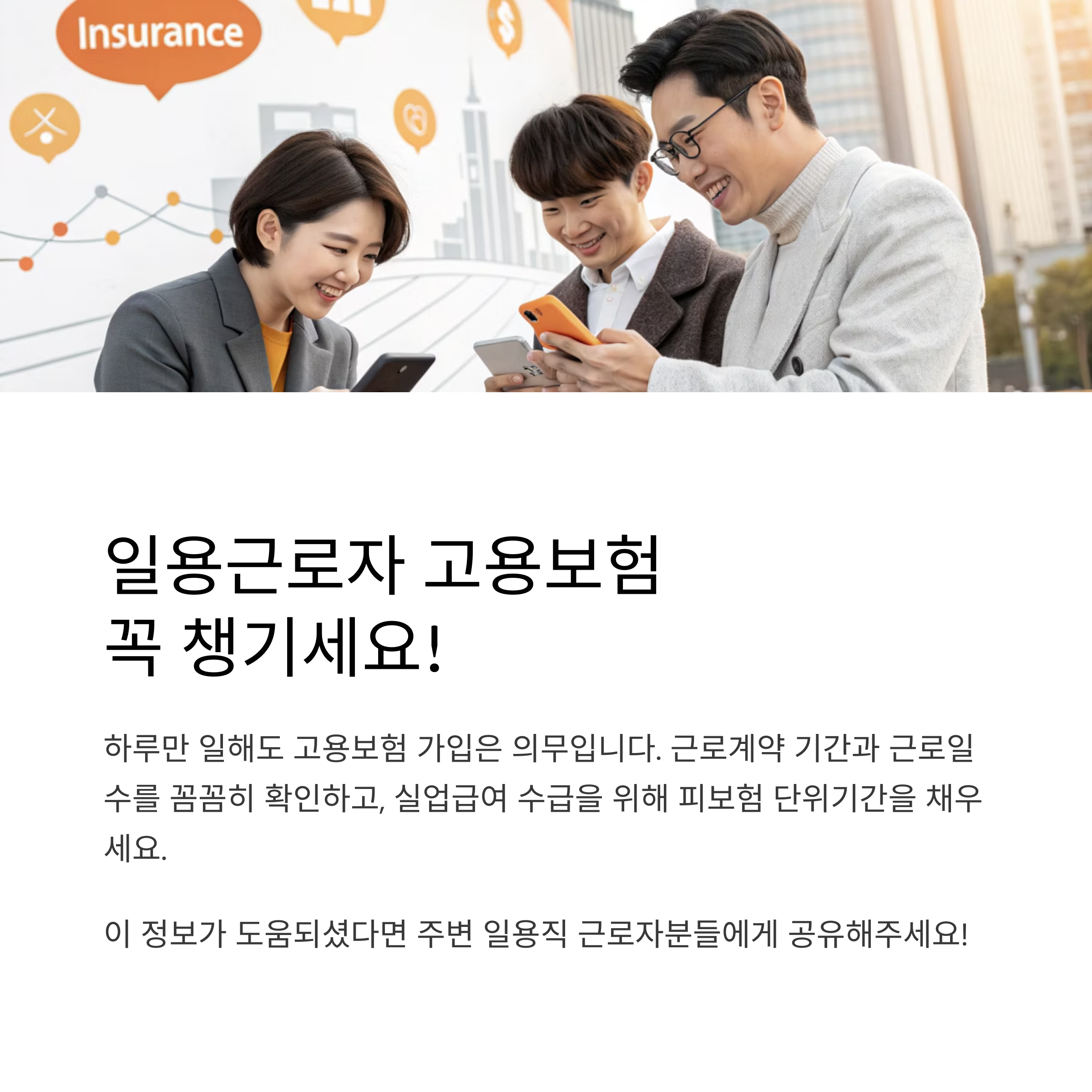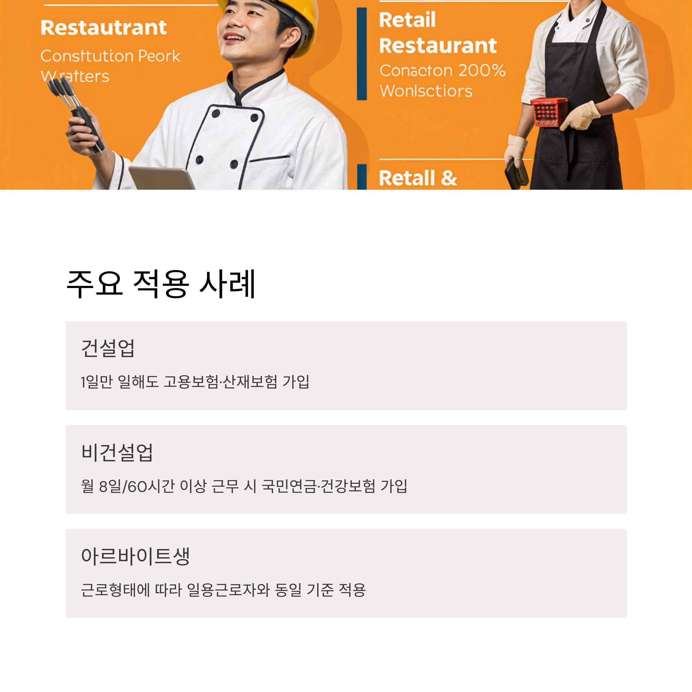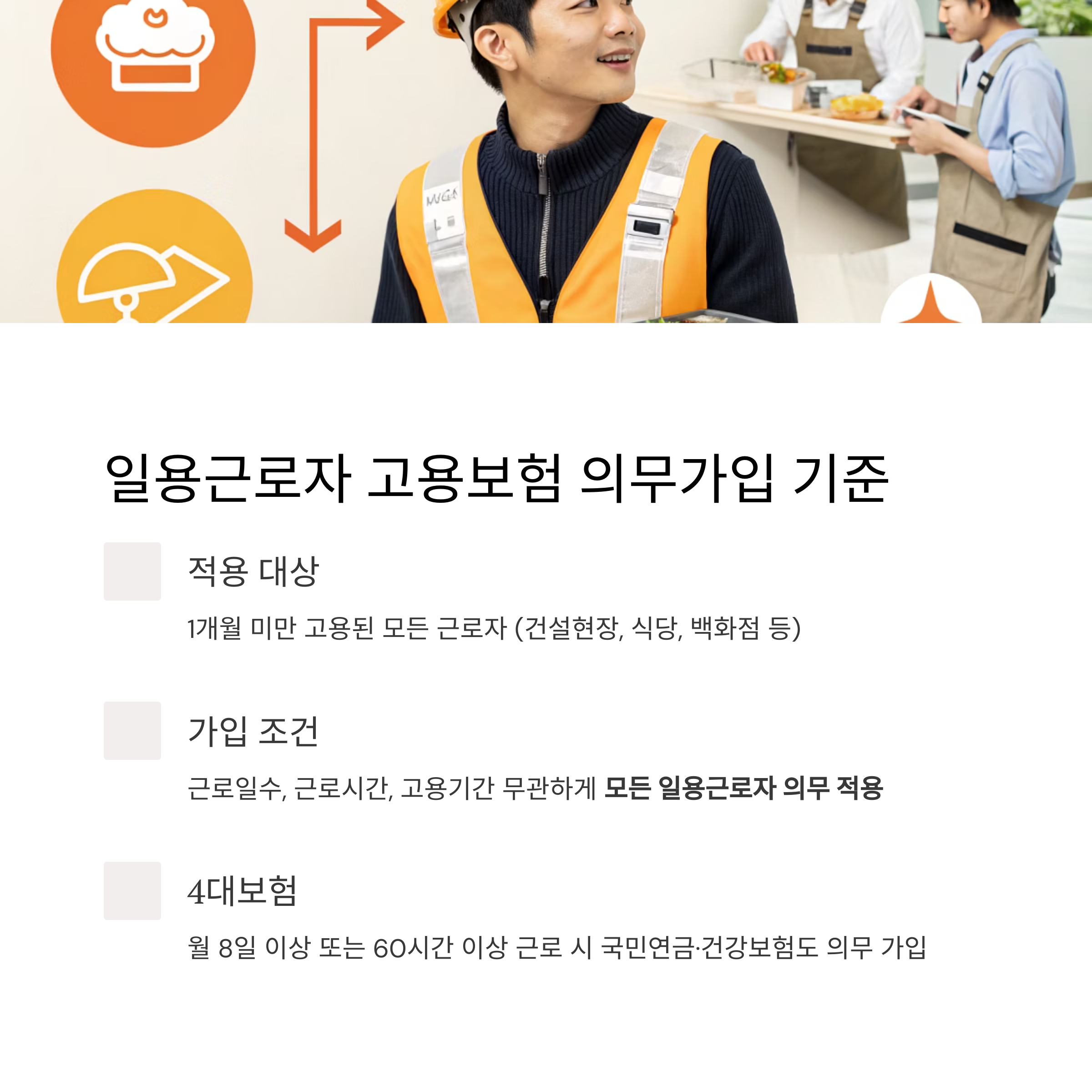 (건설현장 근로자, 식당 주방보조, 백화점 행사직원 등 다양한 업종에 적용) - 고용보험은 근로일수, 근로시간, 고용기간과 무관하게 모든 일용근로자에게 의무 적용됩니다.
