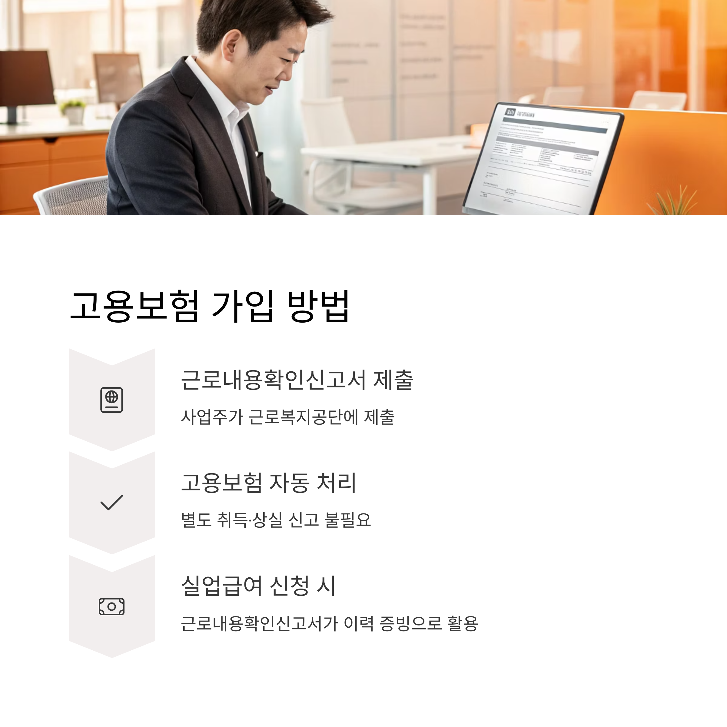 - 사업주가 근로내용확인신고서를 근로복지공단에 제출하면 고용보험 및 산재보험 가입이 동시에 처리됩니다.