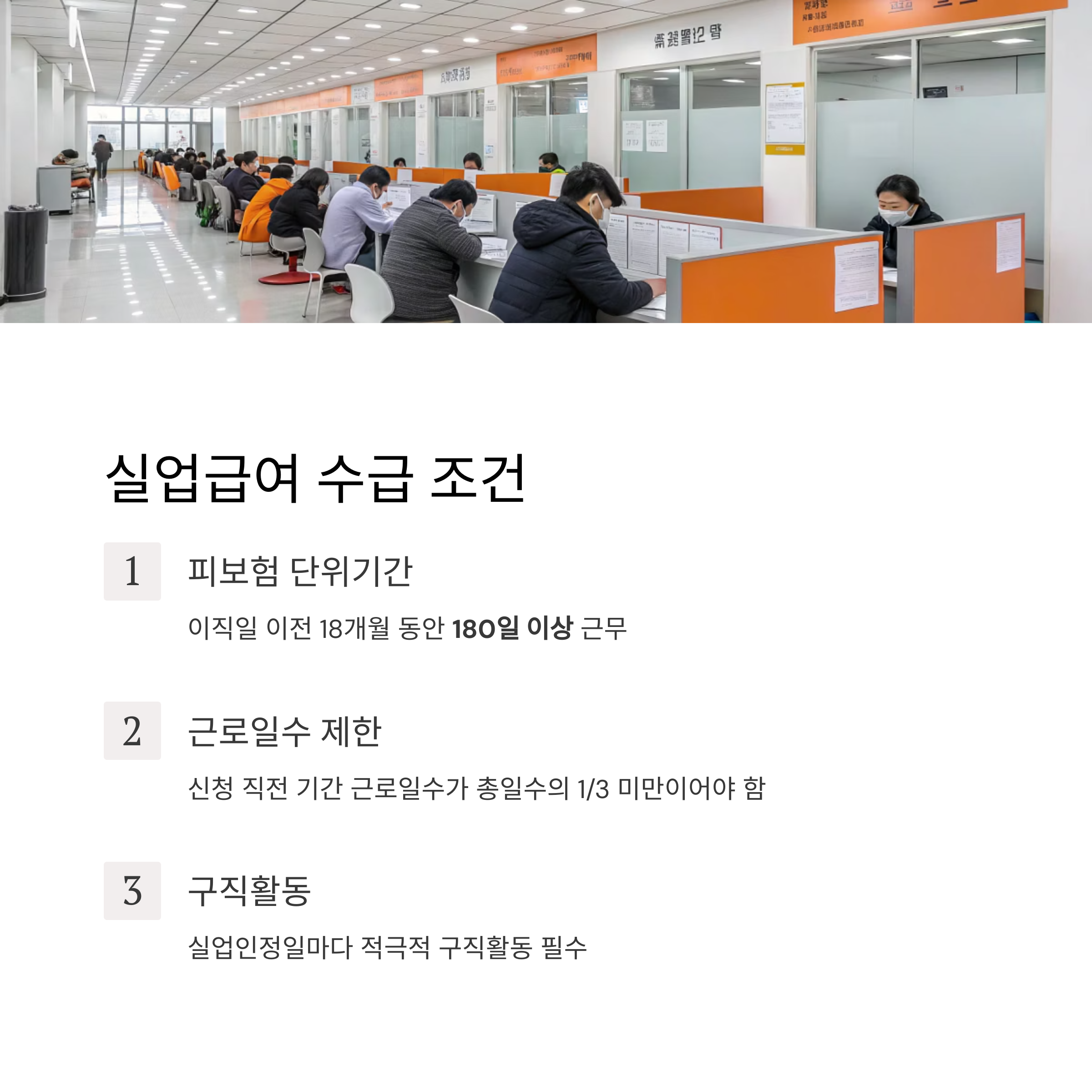 - 이직일 이전 18개월 동안 피보험 단위기간 180일 이상 충족(일한 날만 인정, 1일=1일)