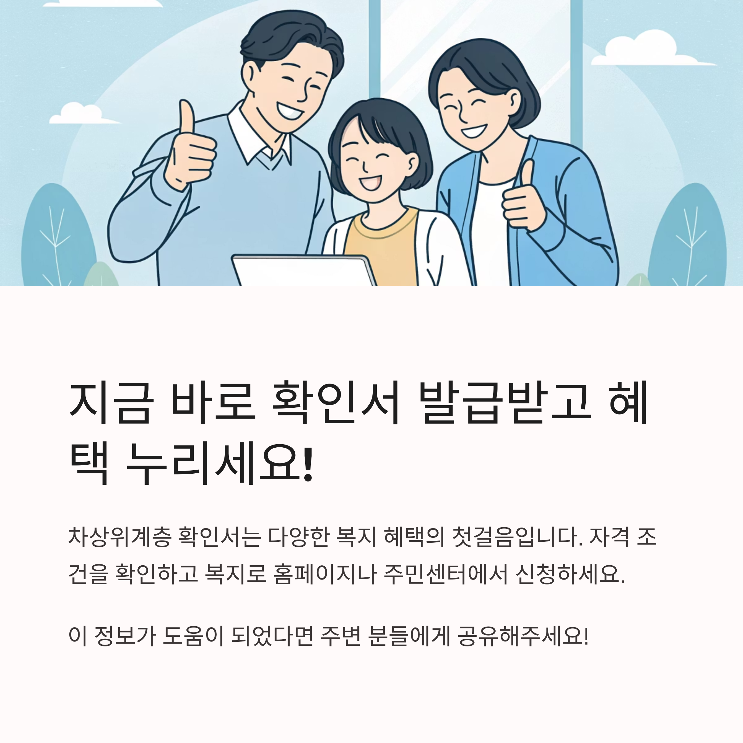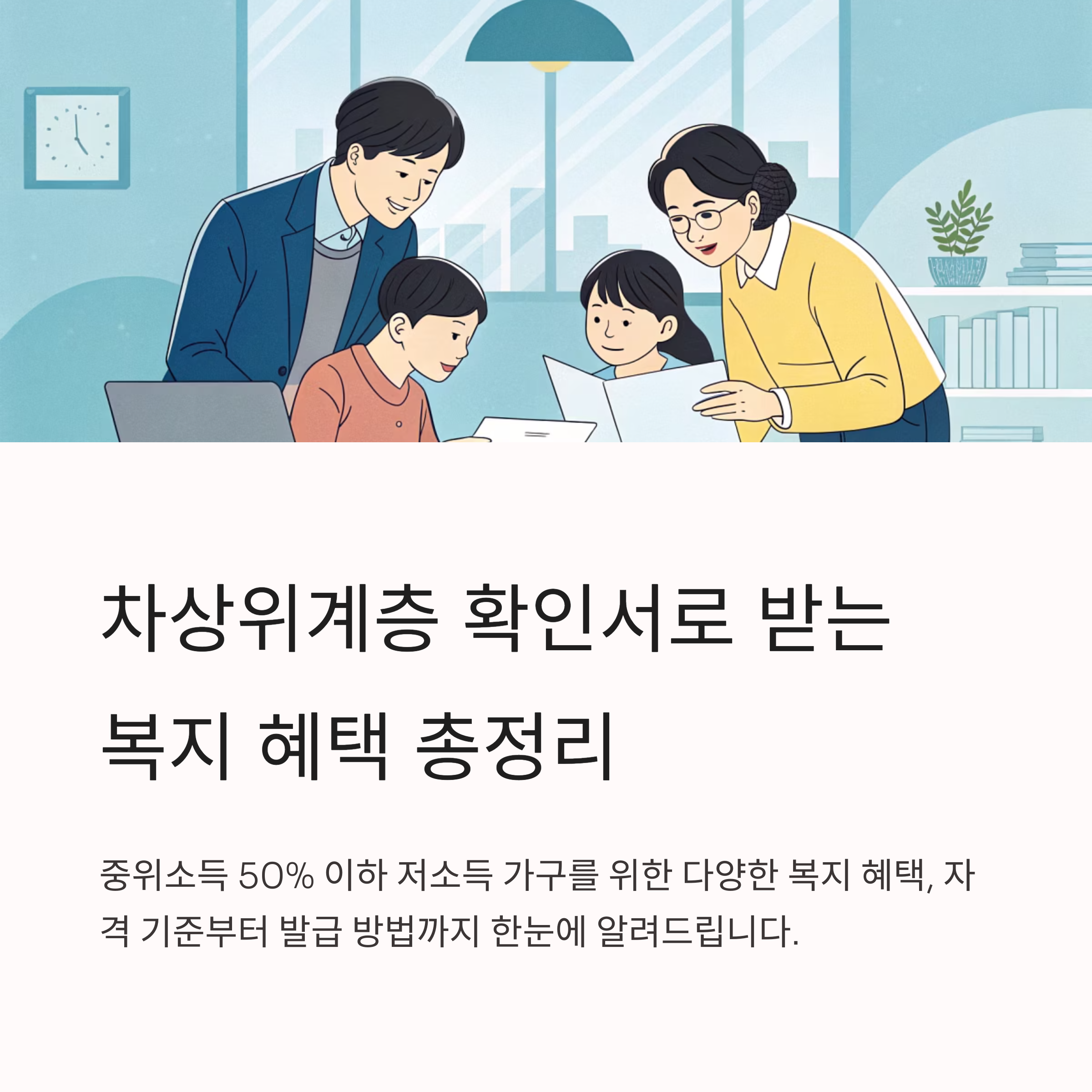 차상위계층은 기준 중위소득 50% 이하이지만 기초생활수급자에는 해당하지 않는 저소득 가구로, 다양한 복지 혜택을 받을 수 있는 중요한 계층입니다. 차상위계층 확인서 발급은 각종 공공요금 감면, 바우처, 의료·교육·주거 지원 등 정부 복지제도 이용의 첫걸음입니다. 아래에서 자격 기준, 발급 방법, 준비서류, 주요 복지 혜택, 신청 꿀팁까지 꼼꼼하게 안내합니다.