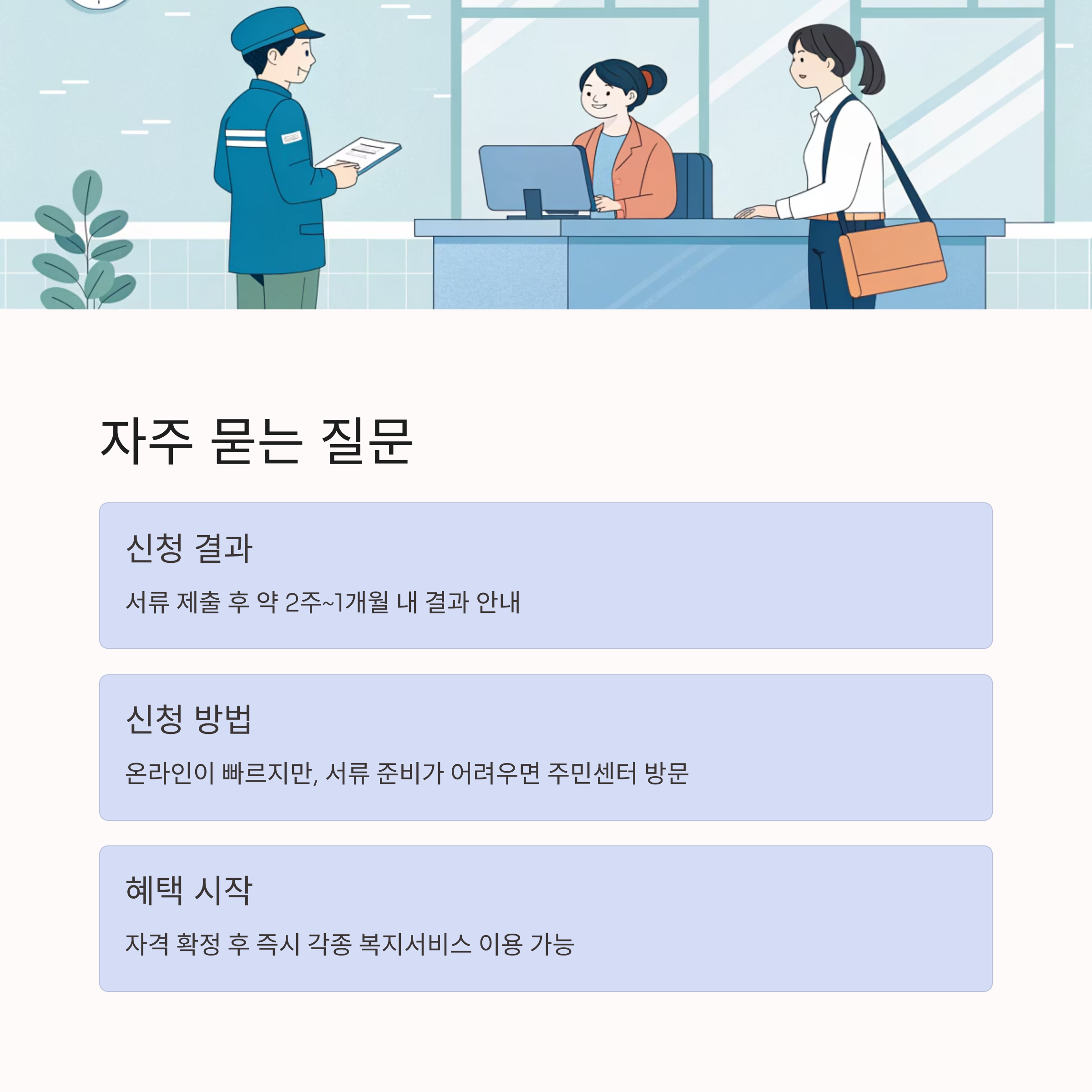온라인 신청이 빠르지만, 서류 준비가 어려우면 주민센터 방문이 안전합니다. - Q. 복지 혜택은 언제부터 받을 수 있나요?