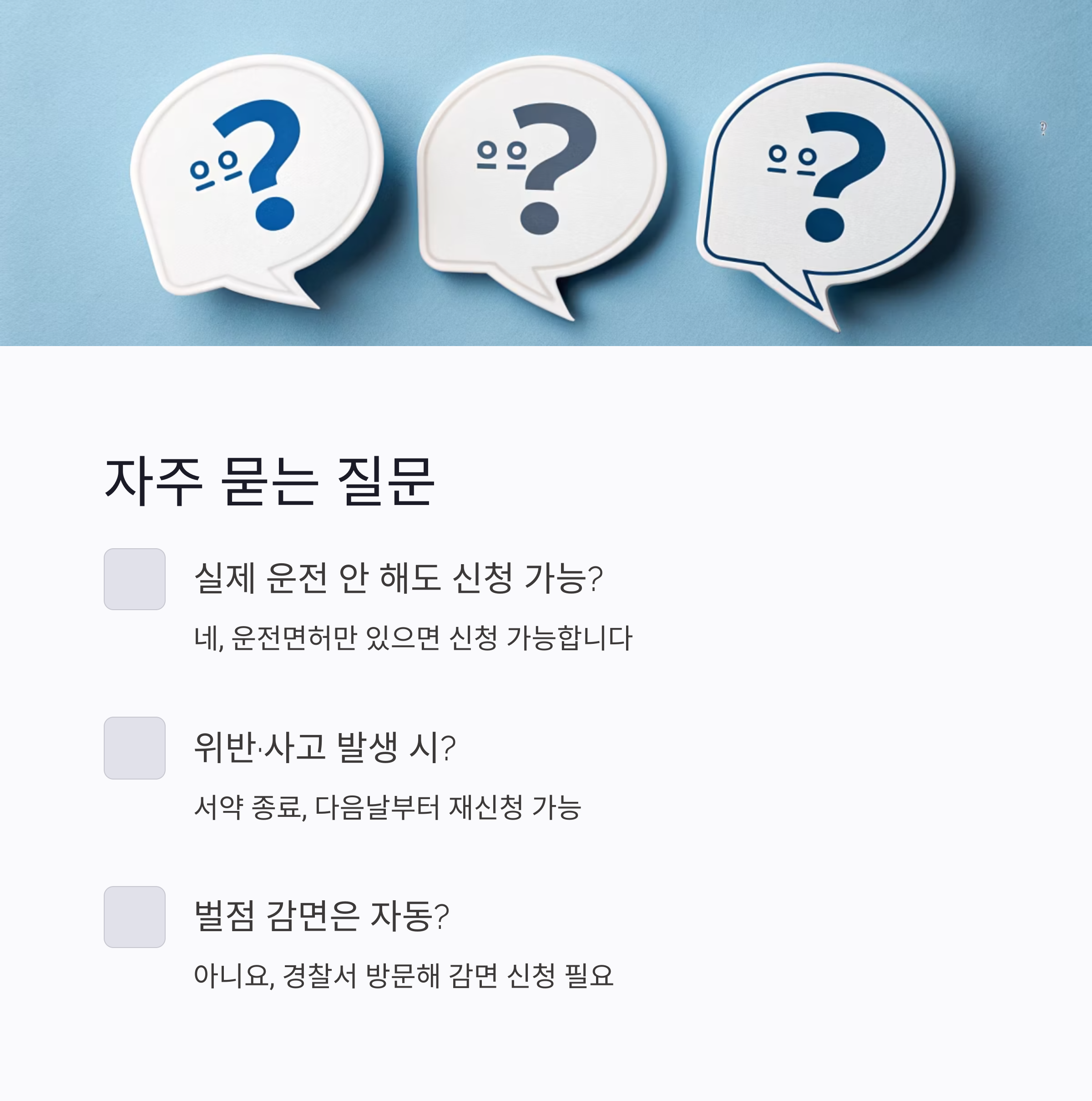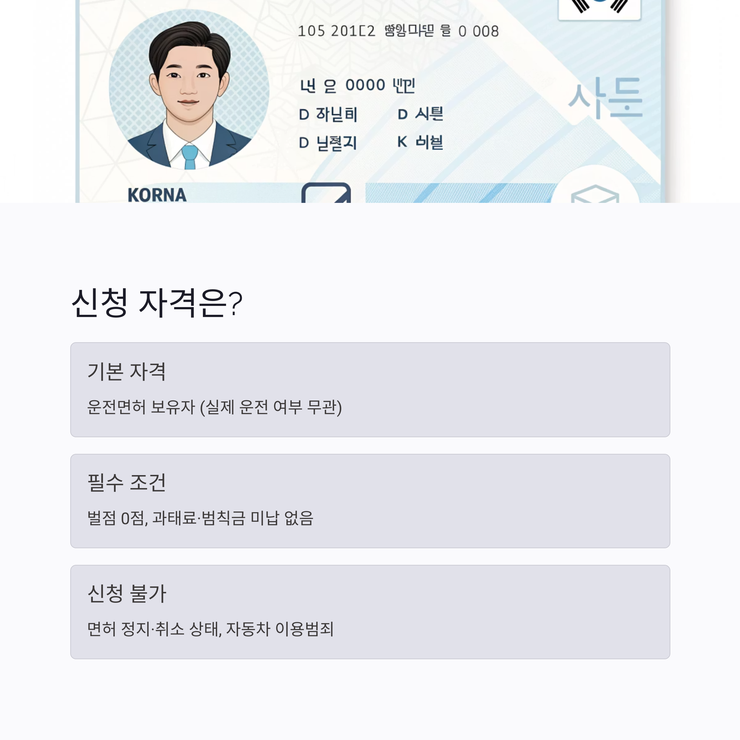- 신청 자격: 운전면허 보유자(1종, 2종, 대형 포함, 실제 운전 여부 무관)