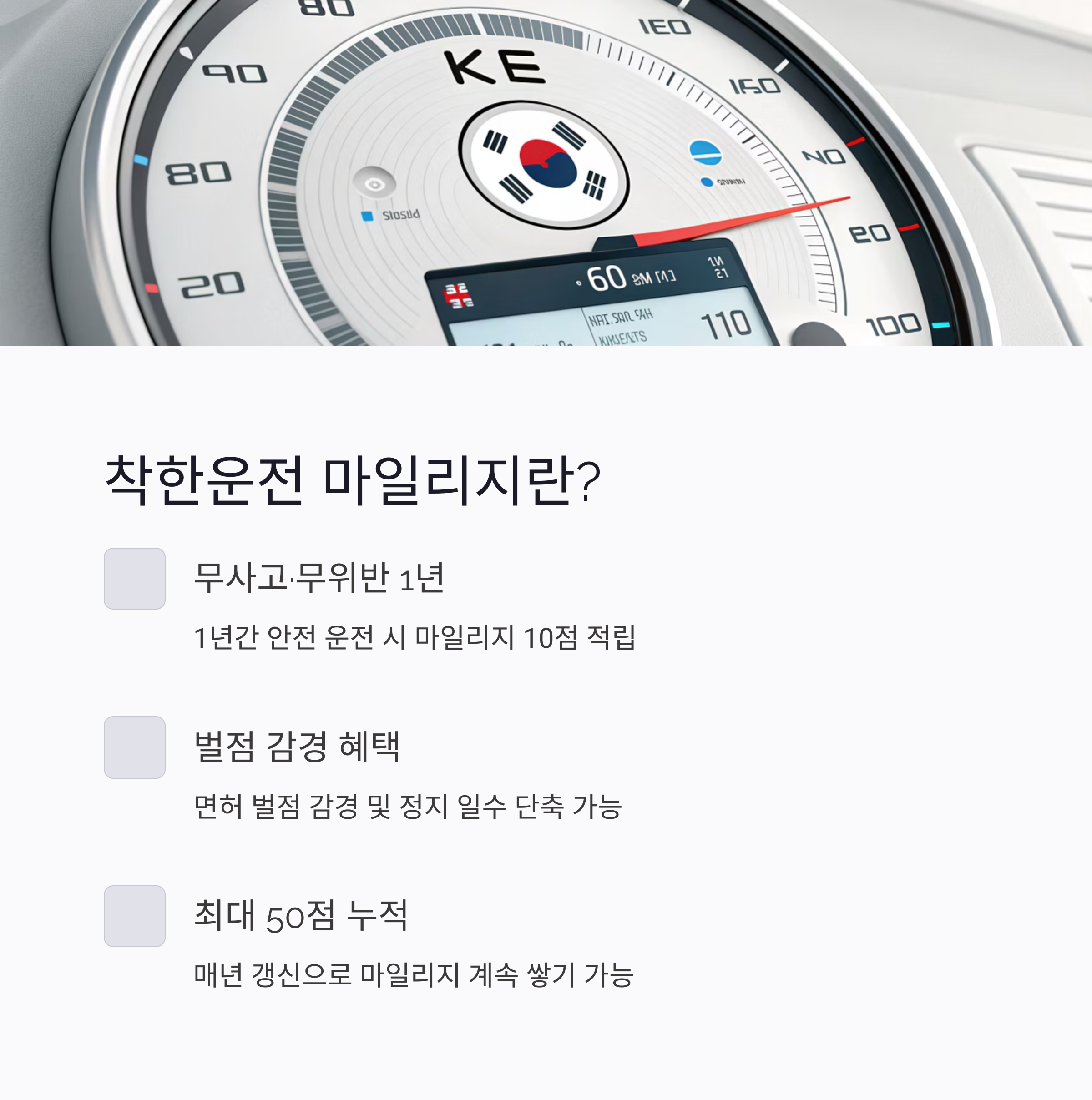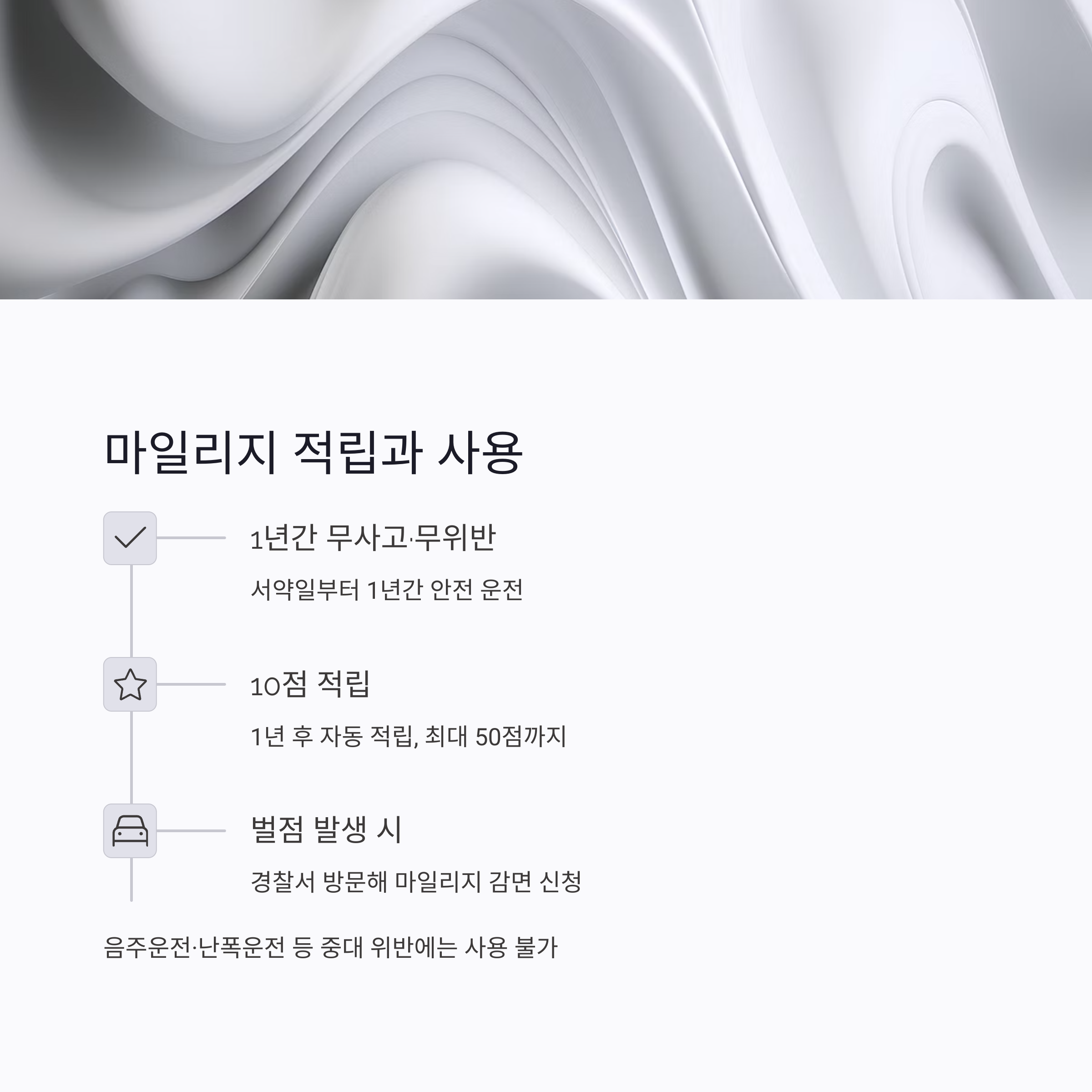 - 운전자가 1년간 무사고·무위반을 실천하면 마일리지 10점이 적립되는 제도