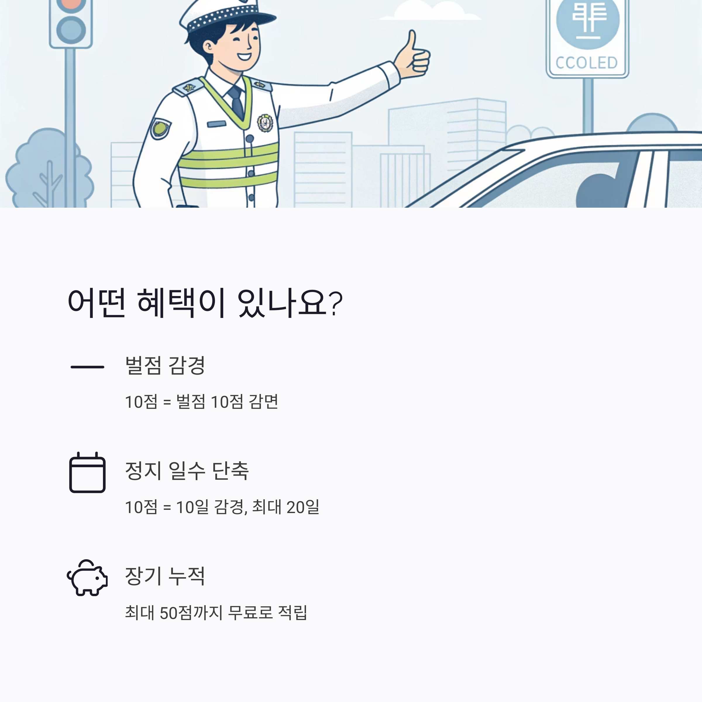 - 면허 정지 일수 단축: 정지 처분 시, 10점 사용 시 10일, 최대 20일까지 감경 가능
