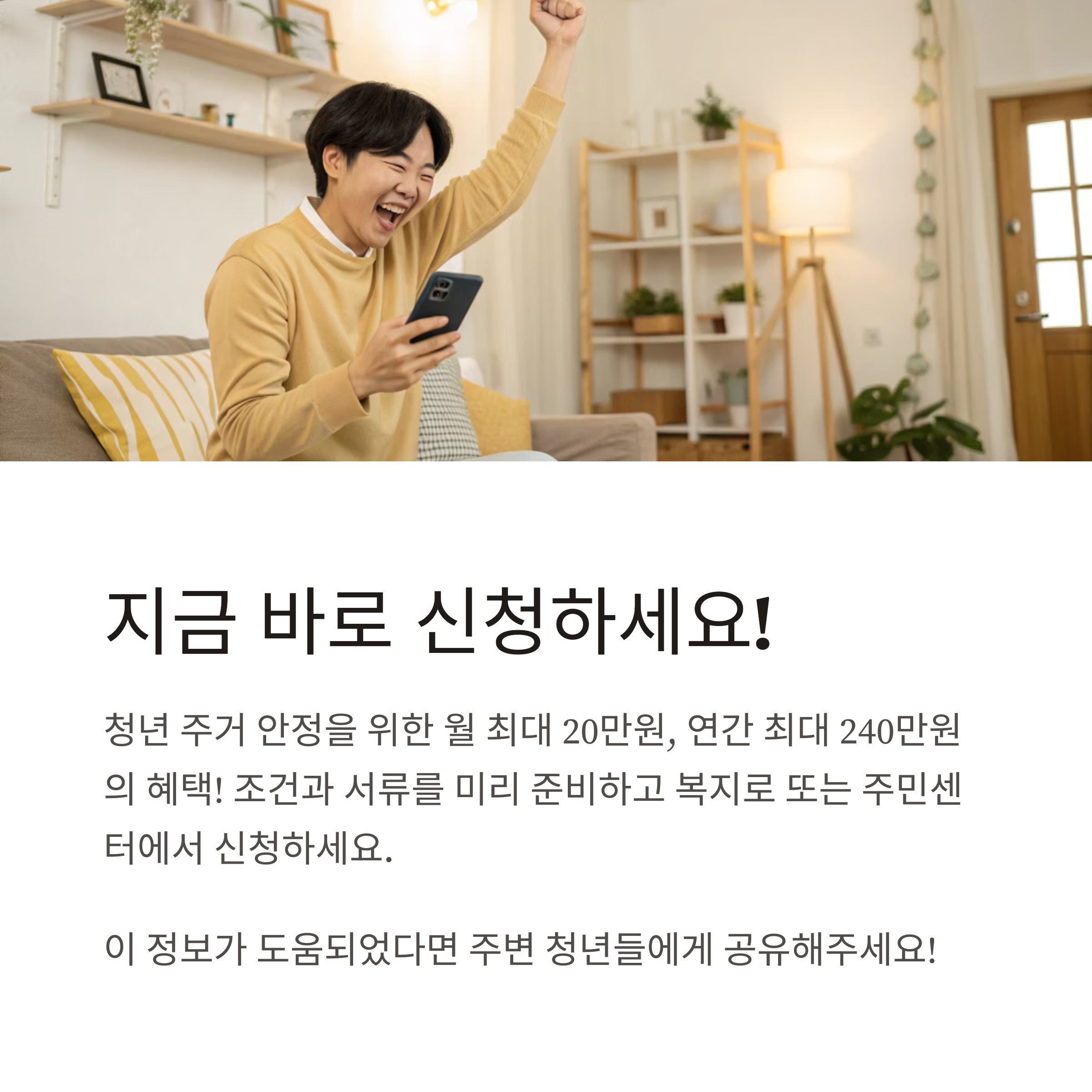 - 거주 조건: 부모와 별도 거주(전입신고 필수), 본인 명의 임대차계약서 소지