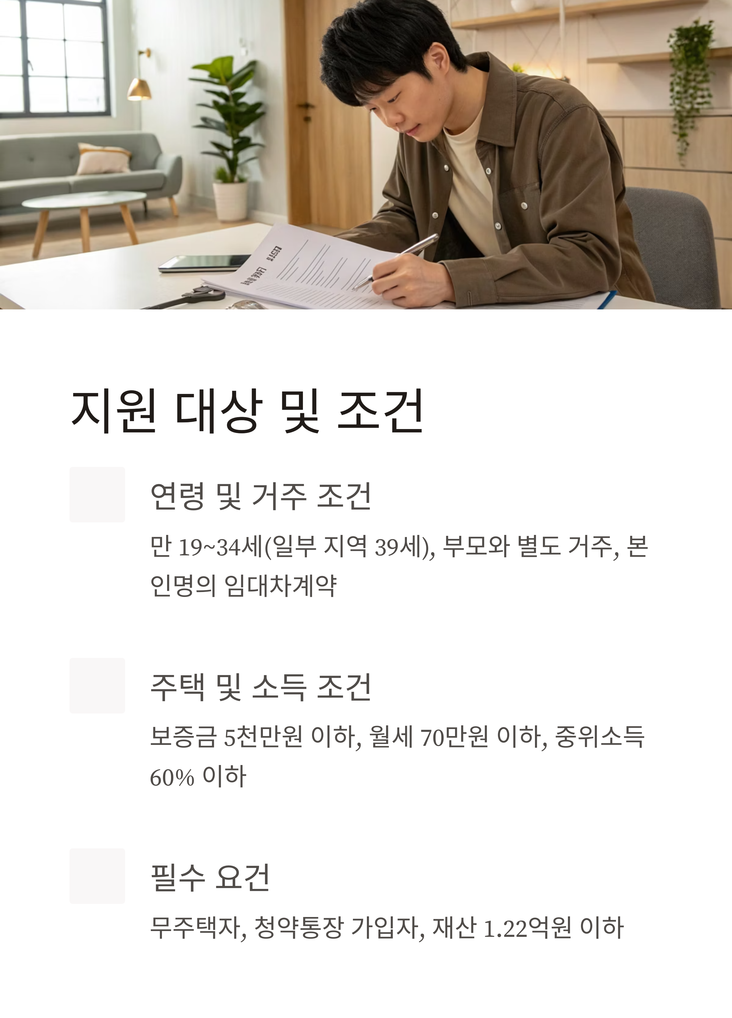 - 청년가구(본인+배우자+직계비속): 기준 중위소득 60% 이하(1인 기준 월 133만 원), 재산 1.22억 원 이하