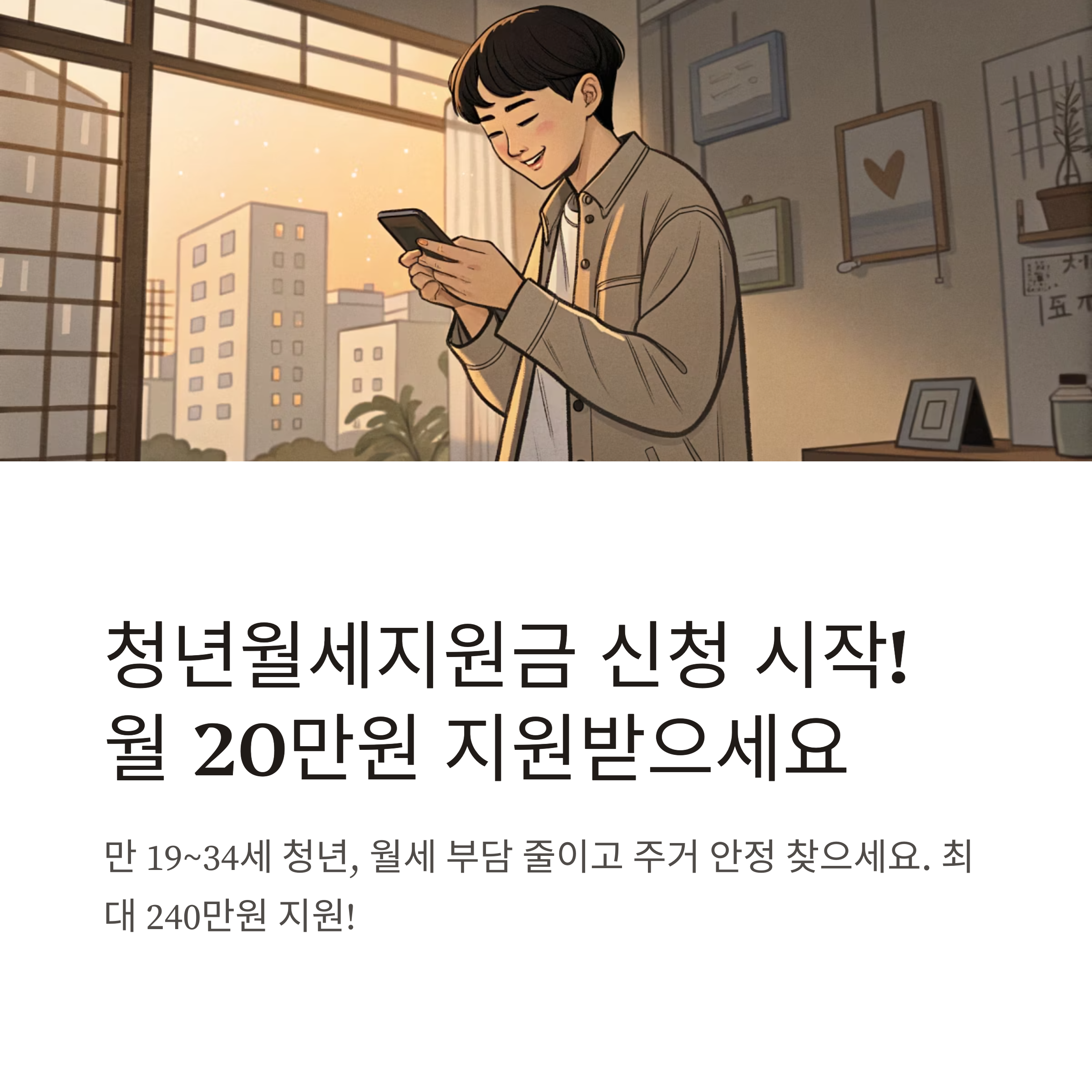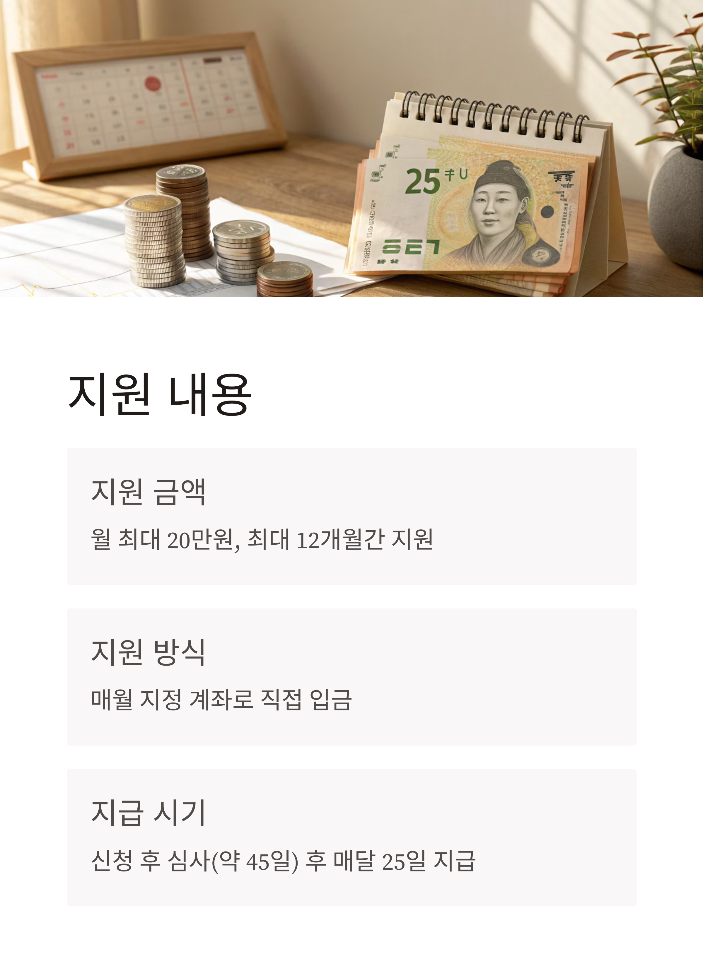 - 지원 금액: 월 최대 20만 원(실제 월세액 한도 내), 최대 12개월(총 240만 원)