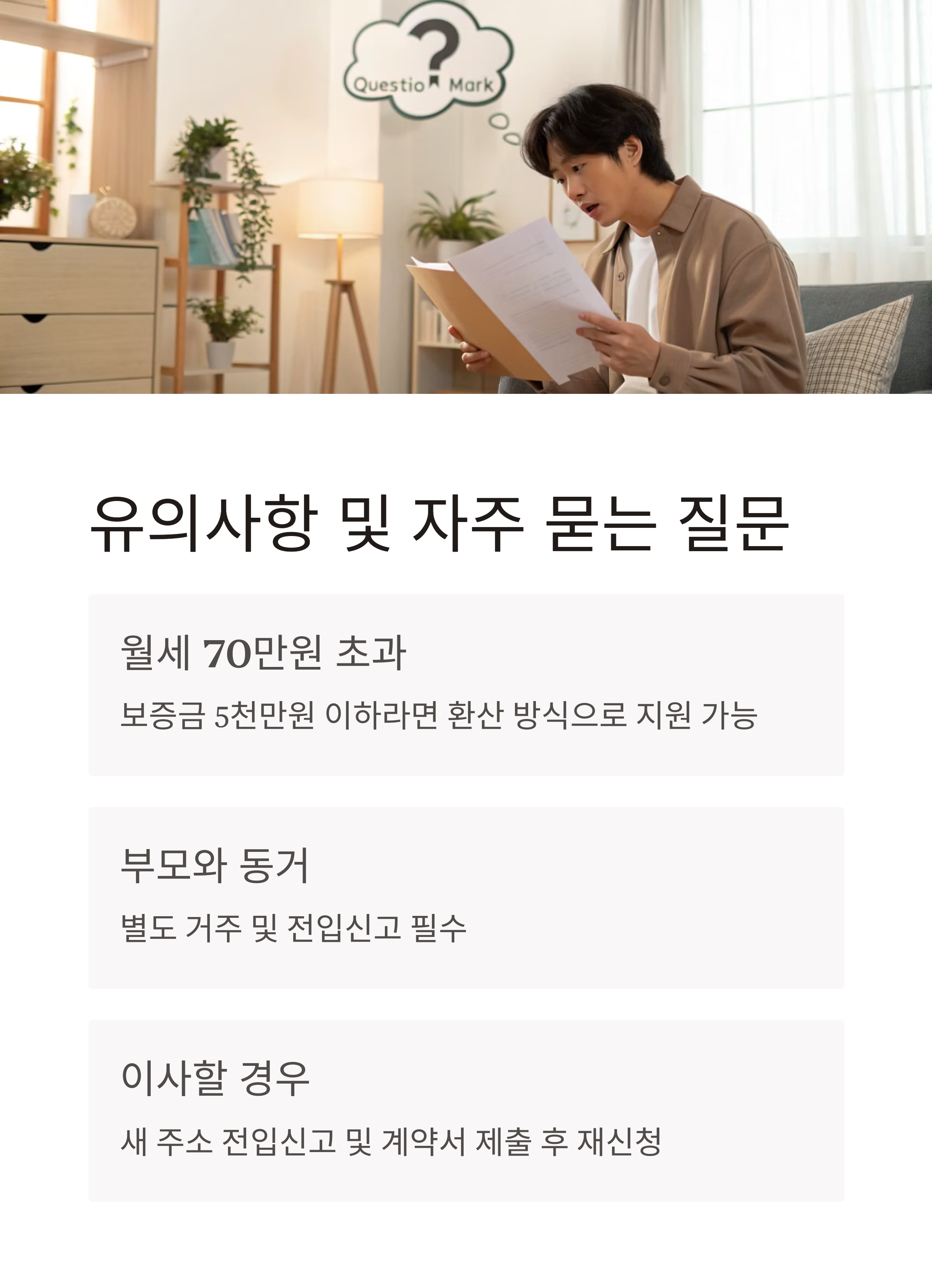 - 주택 조건: 보증금 5,000만 원 이하, 월세 70만 원 이하 주택(보증금이 작고 월세가 70만 원을 초과해도 일부 환산 방식으로 지원 가능)