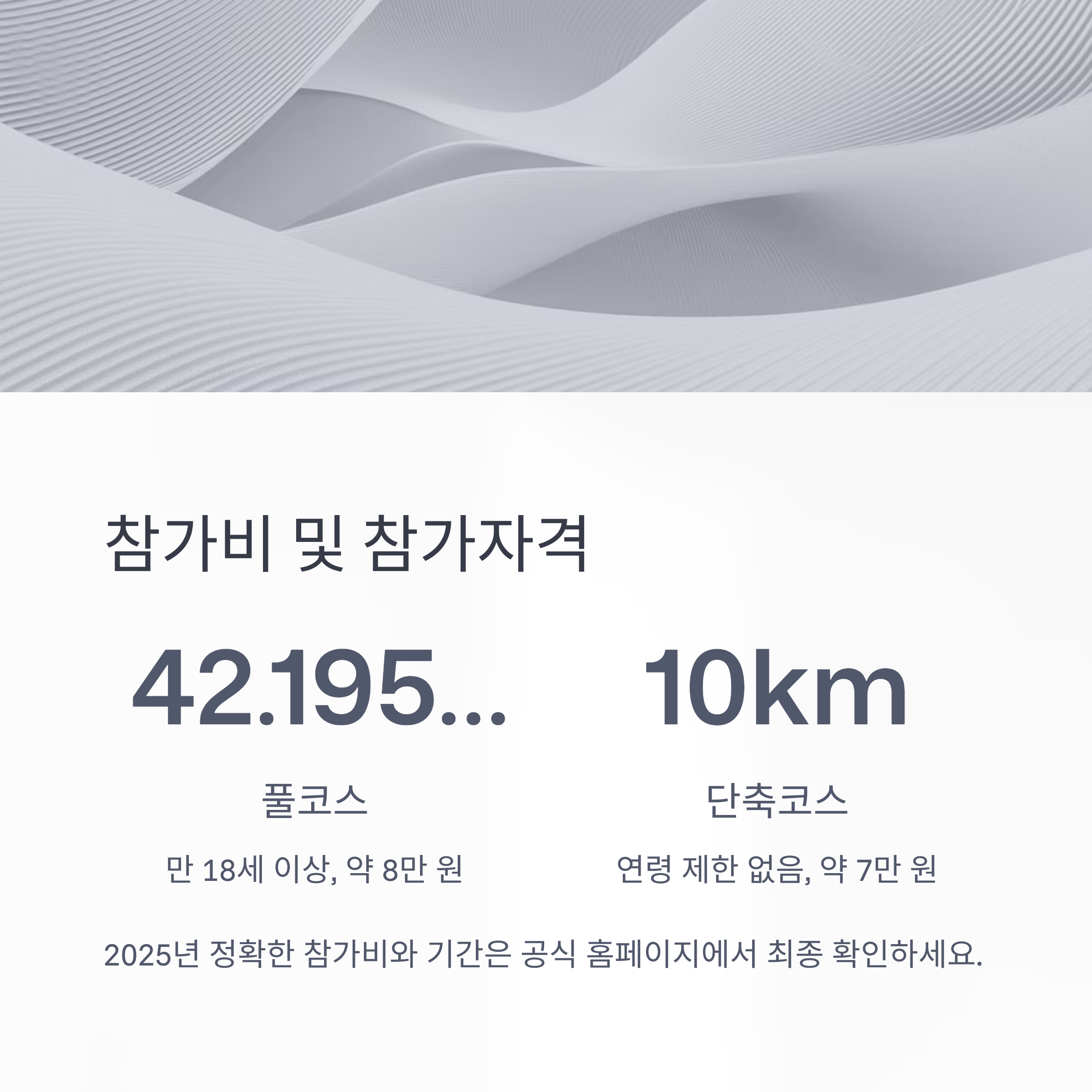 - 풀코스(42.195km): 만 18세 이상(2025년 10월 26일 기준), 참가비 약 8만 원(2025년 기준, 공식 홈페이지 참고)