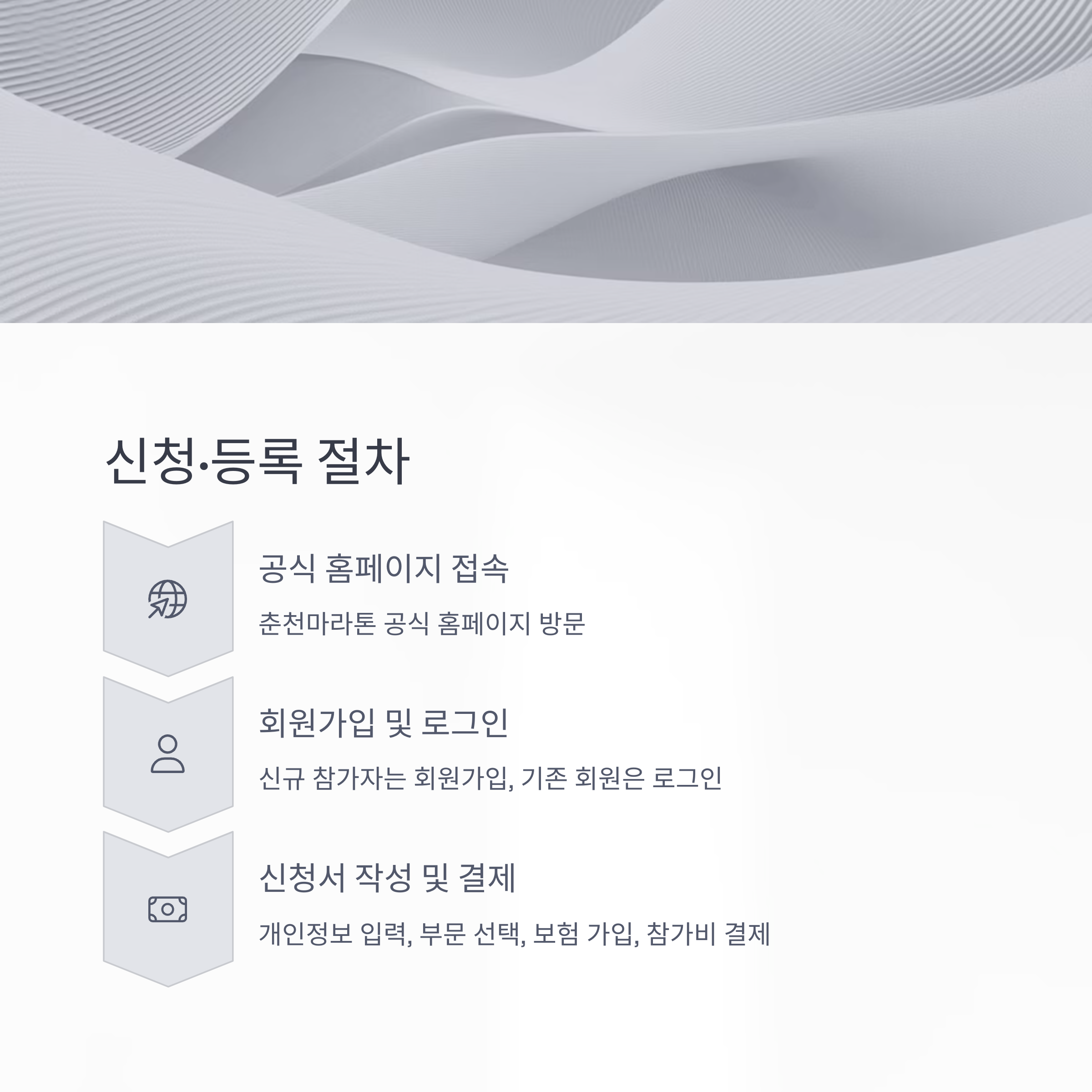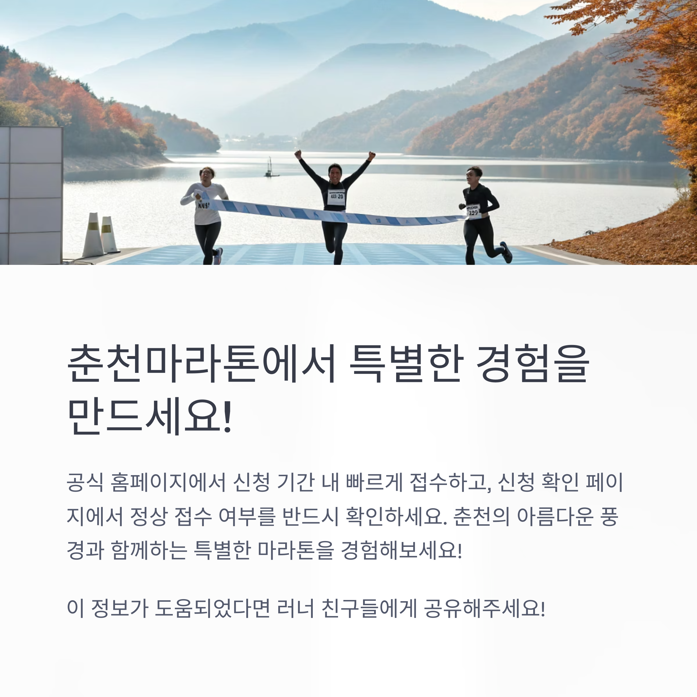 춘천마라톤 신청은 공식 홈페이지에서 간편하게 할 수 있으며, 개인 및 단체 모두 온라인으로만 접수됩니다. 신청 기간 내 빠르게 접수하고, 신청확인 페이지에서 정상 접수 여부를 반드시 확인하세요. 단체 신청 시 단체 코드를 정확히 입력하고, 참가비 결제까지 완료해야 신청이 확정됩니다. 춘천의 아름다운 풍경과 함께하는 특별한 마라톤 경험을 누려보세요!