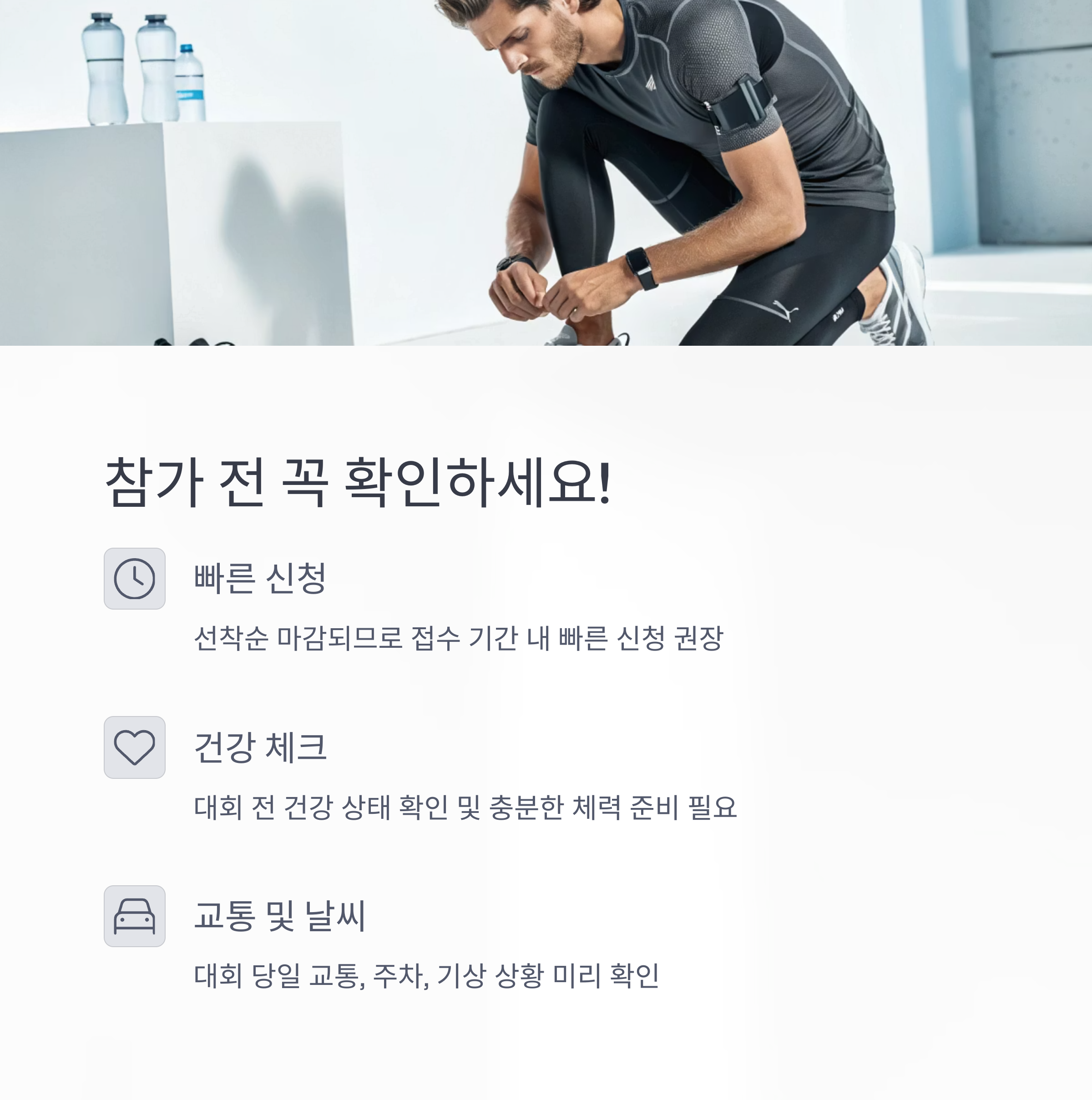 - 대회 당일 교통, 주차, 기상 상황 미리 확인