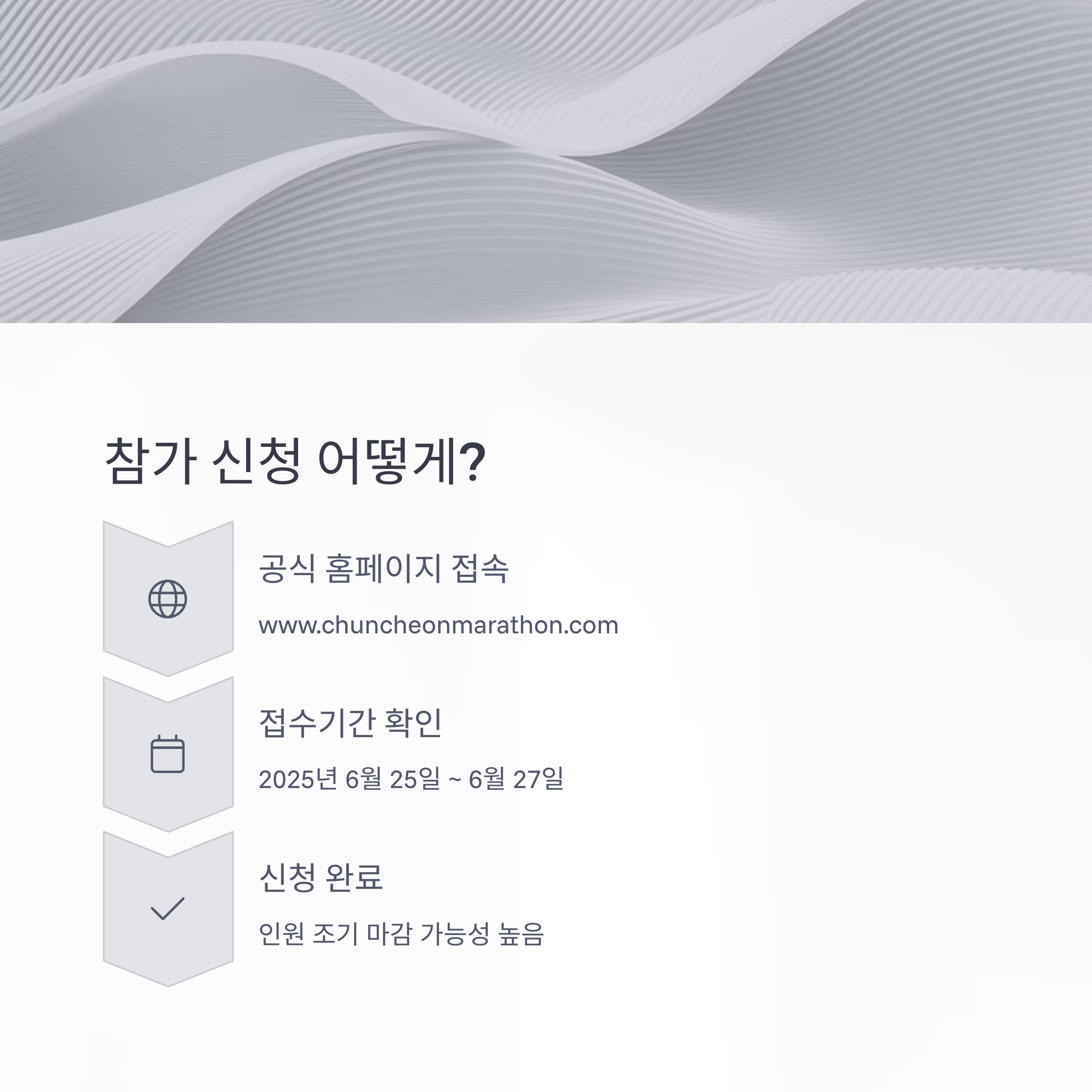 - 공식 홈페이지: 춘천마라톤 공식 홈페이지(www.chuncheonmarathon.com) 접속