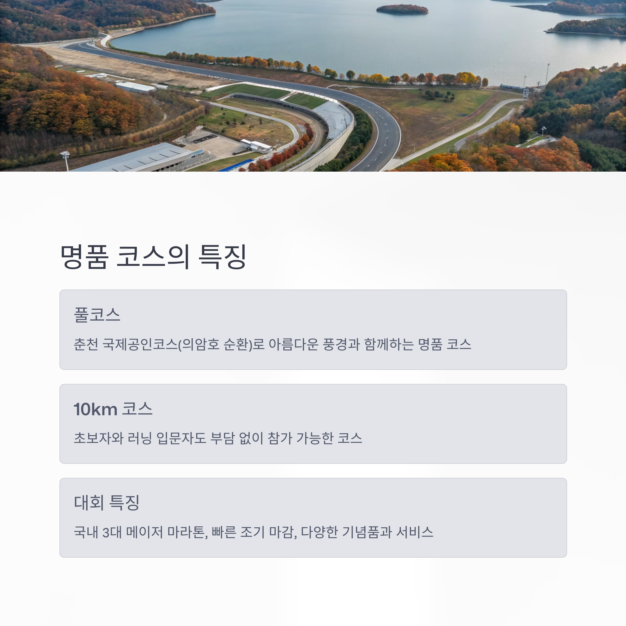 - 풀코스(42.195km): 춘천 국제공인코스(의암호 순환코스)로, 춘천의 아름다운 풍경을 감상하며 달릴 수 있는 명품 코스
