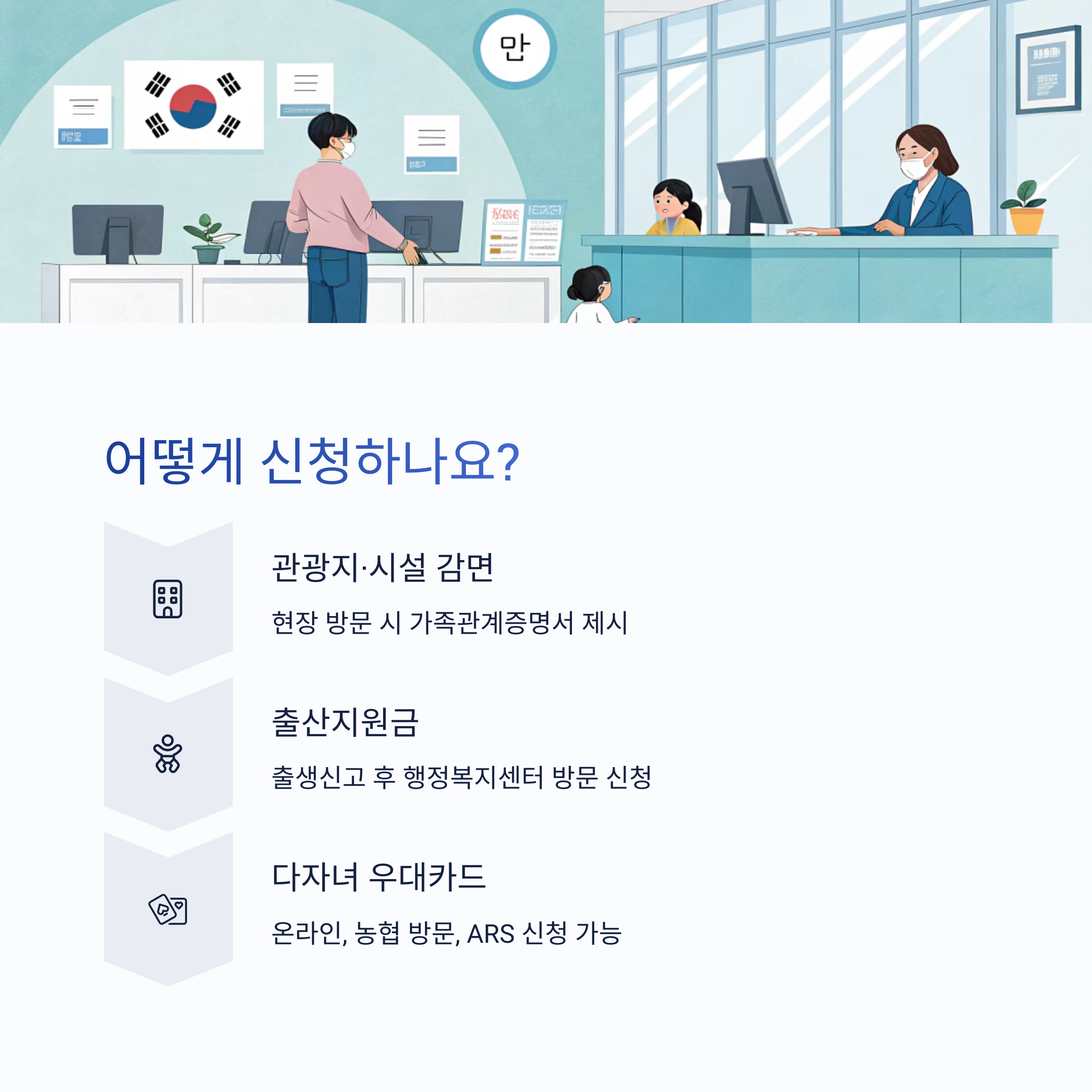 - 다자녀 우대카드: 온라인(강원도청 복지포털), 농협 방문, 또는 ARS 신청