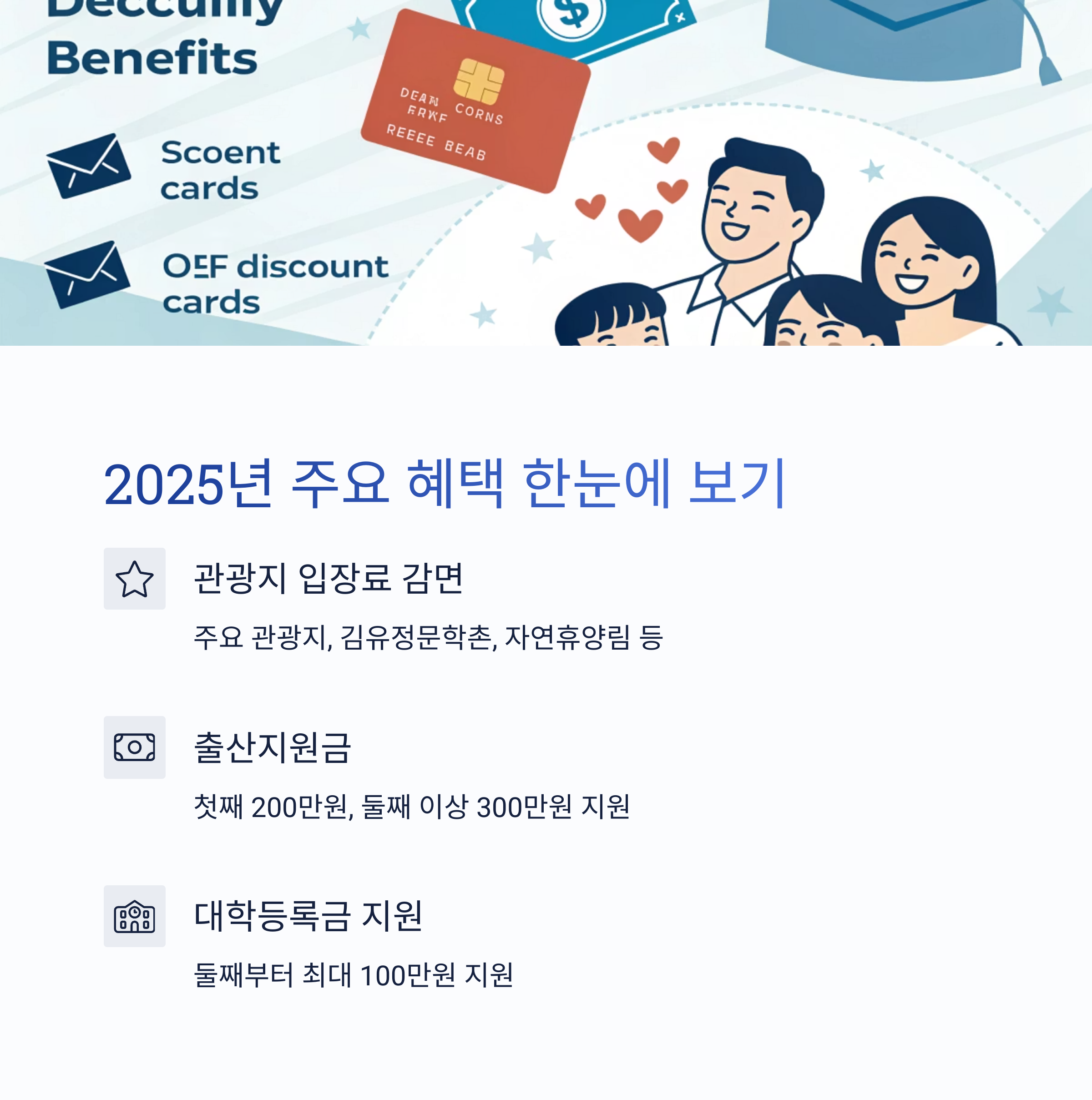 춘천시는 2025년부터 다자녀 가구 기준을 기존 '3자녀 이상'에서 '2자녀 이상'으로 완화하여 더 많은 가정에 다양한 혜택과 지원금을 제공합니다. 춘천에 거주하는 2자녀 이상 가정이라면 관광지 입장료 감면, 평생학습관 수강료 할인, 출산지원금, 대학등록금 지원, 다자녀 우대카드 등 실질적인 경제적 혜택을 누릴 수 있습니다. 아래에서 각 혜택별 상세 내용, 신청 방법, 준비서류, 유의사항, FAQ까지 꼼꼼히 안내해드립니다.
