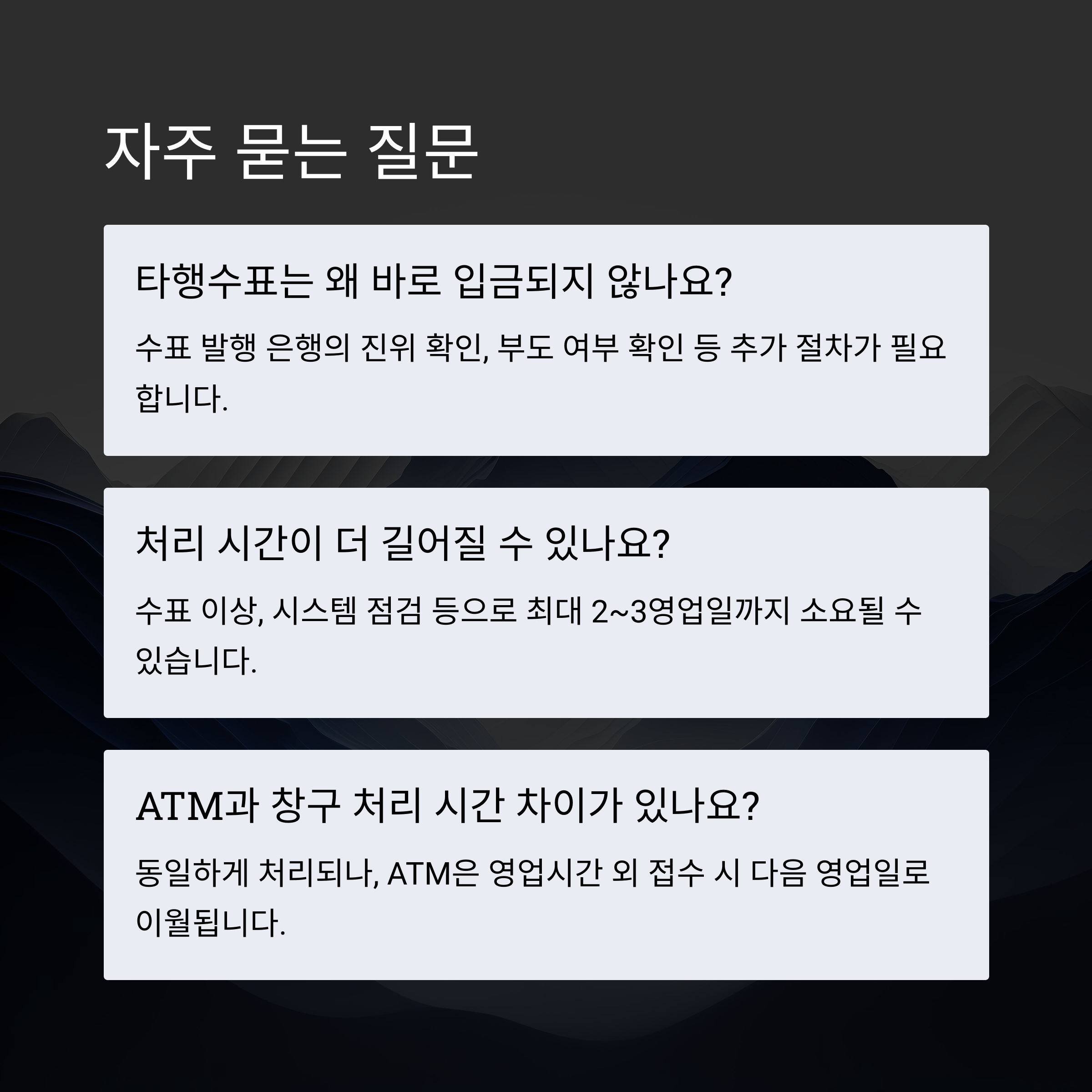 A. 수표 발행 은행의 진위 확인, 부도 여부 확인 등 추가 절차가 필요하기 때문입니다. - Q. 수표 입금 처리 시간이 더 길어질 수 있나요?