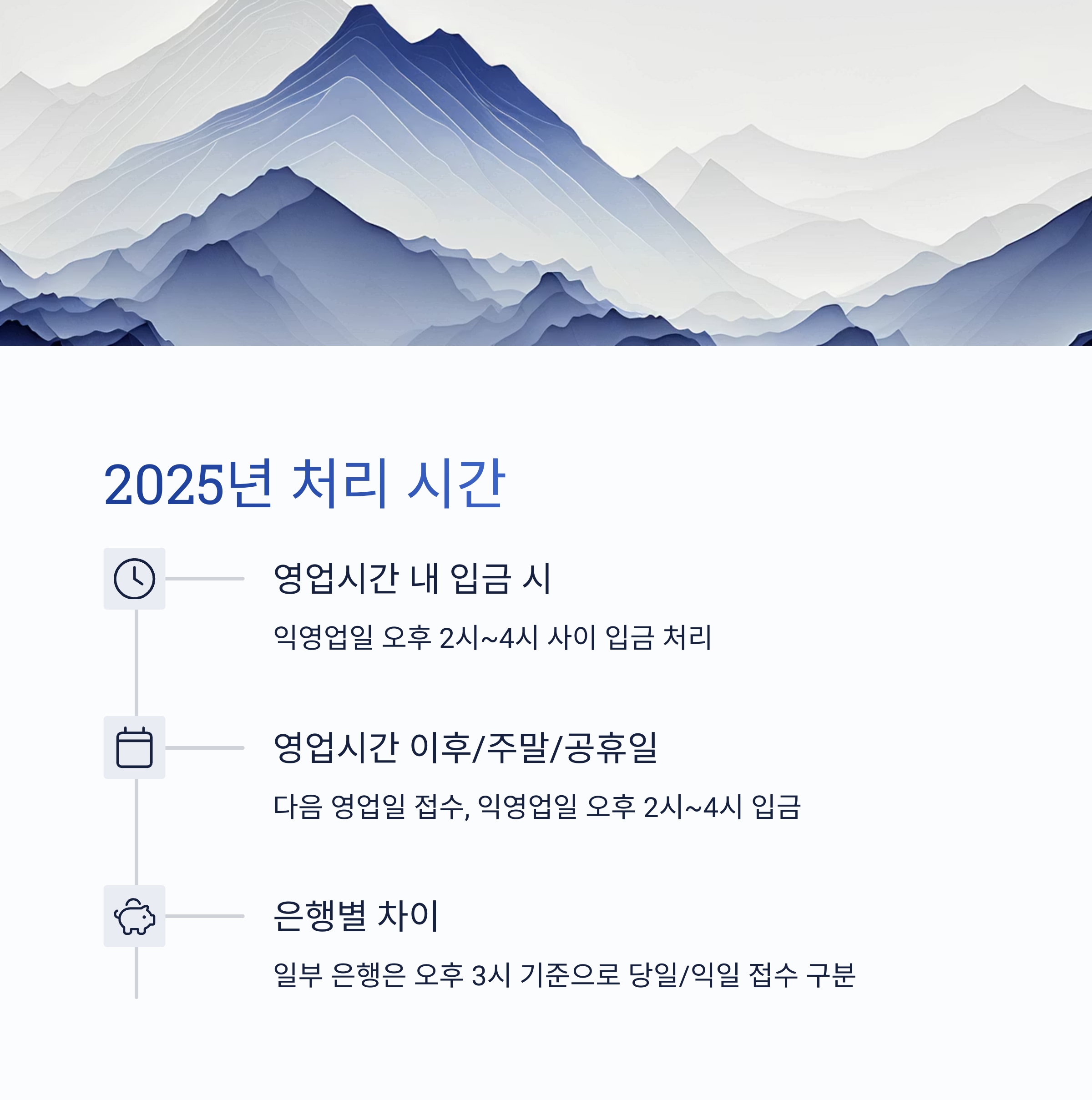 - 일부 은행(국민, 신한, 우리 등)은 오후 3시 이전 입금 시 당일 접수, 이후는 다음 영업일 접수