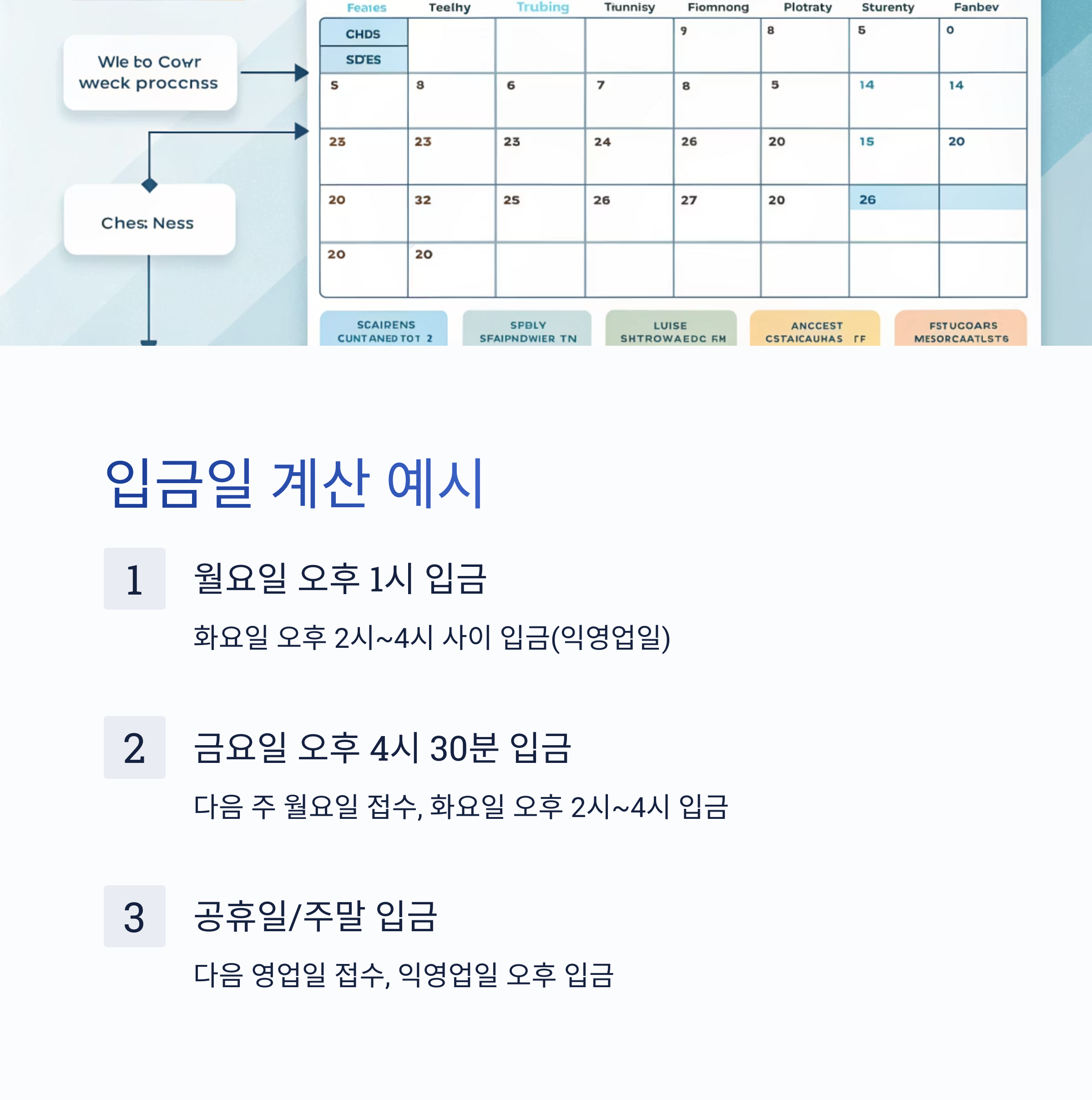 → 다음 주 월요일 접수, 화요일 오후 2시~4시 사이 입금 - 예시 3: 공휴일 또는 주말 입금
