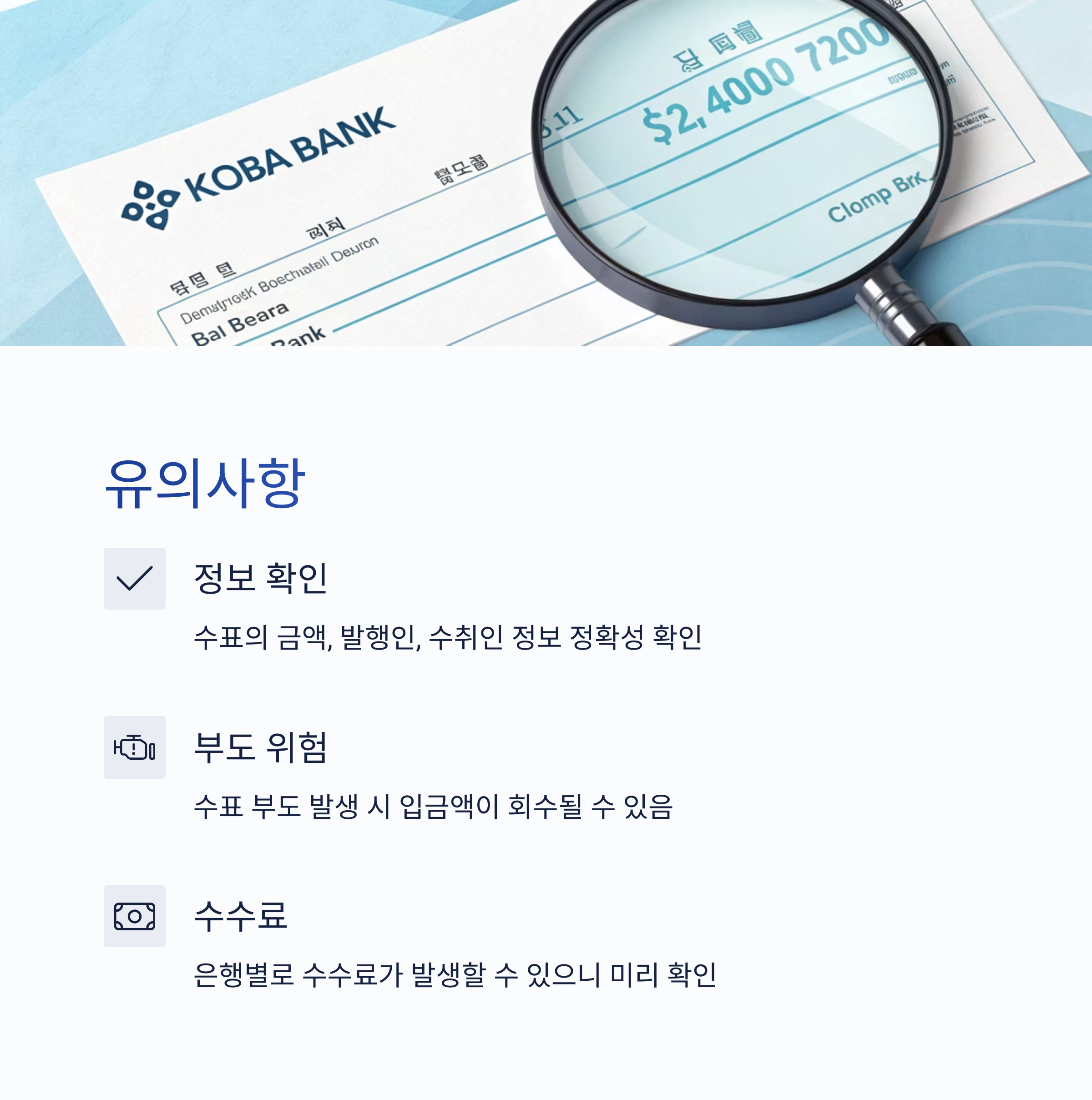 - 입금 후에도 수표 부도 발생 시 입금액이 회수될 수 있으니, 거래 상대방 신뢰도 확인