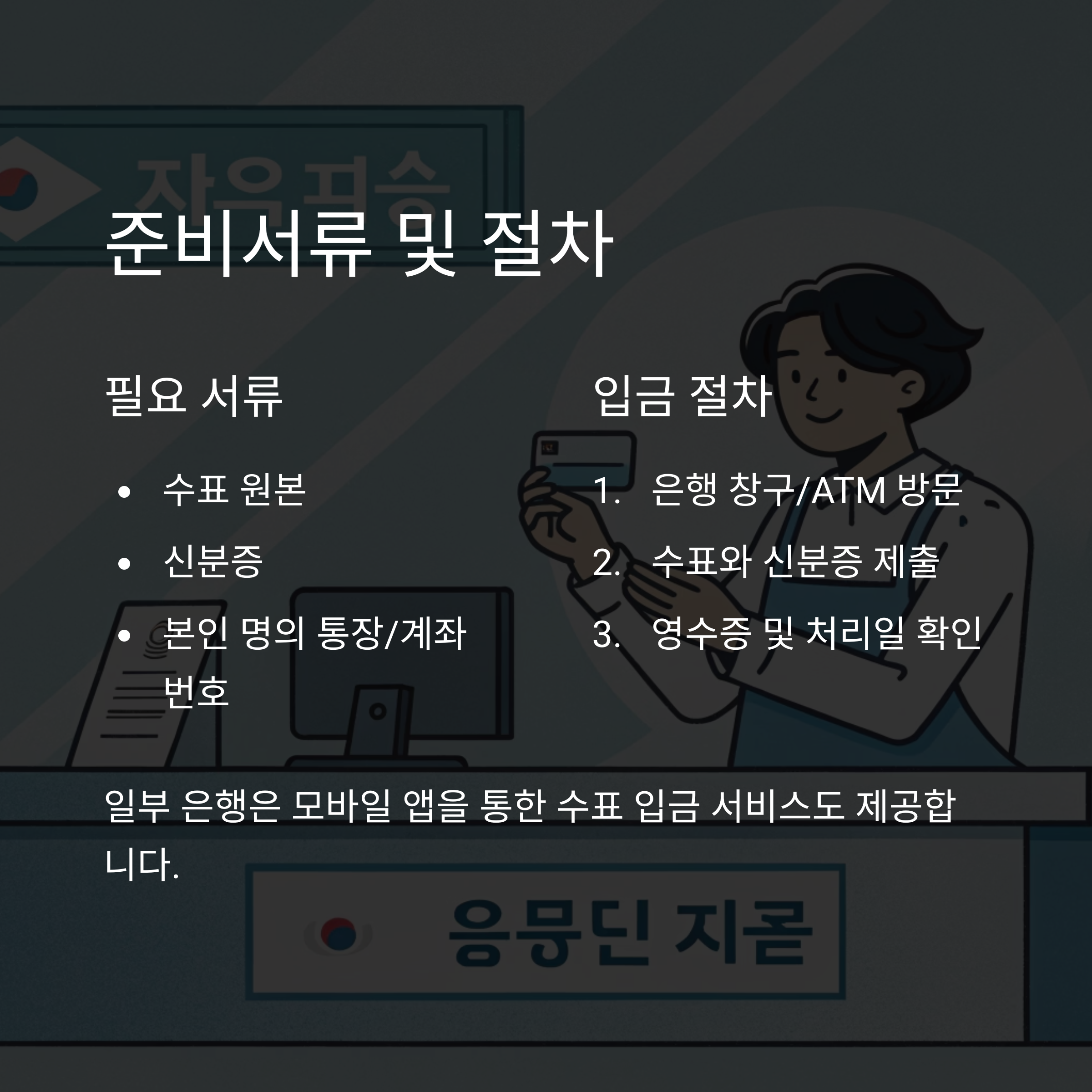 - 은행별로 마감 시간이 다르니 반드시 사전에 확인 필요