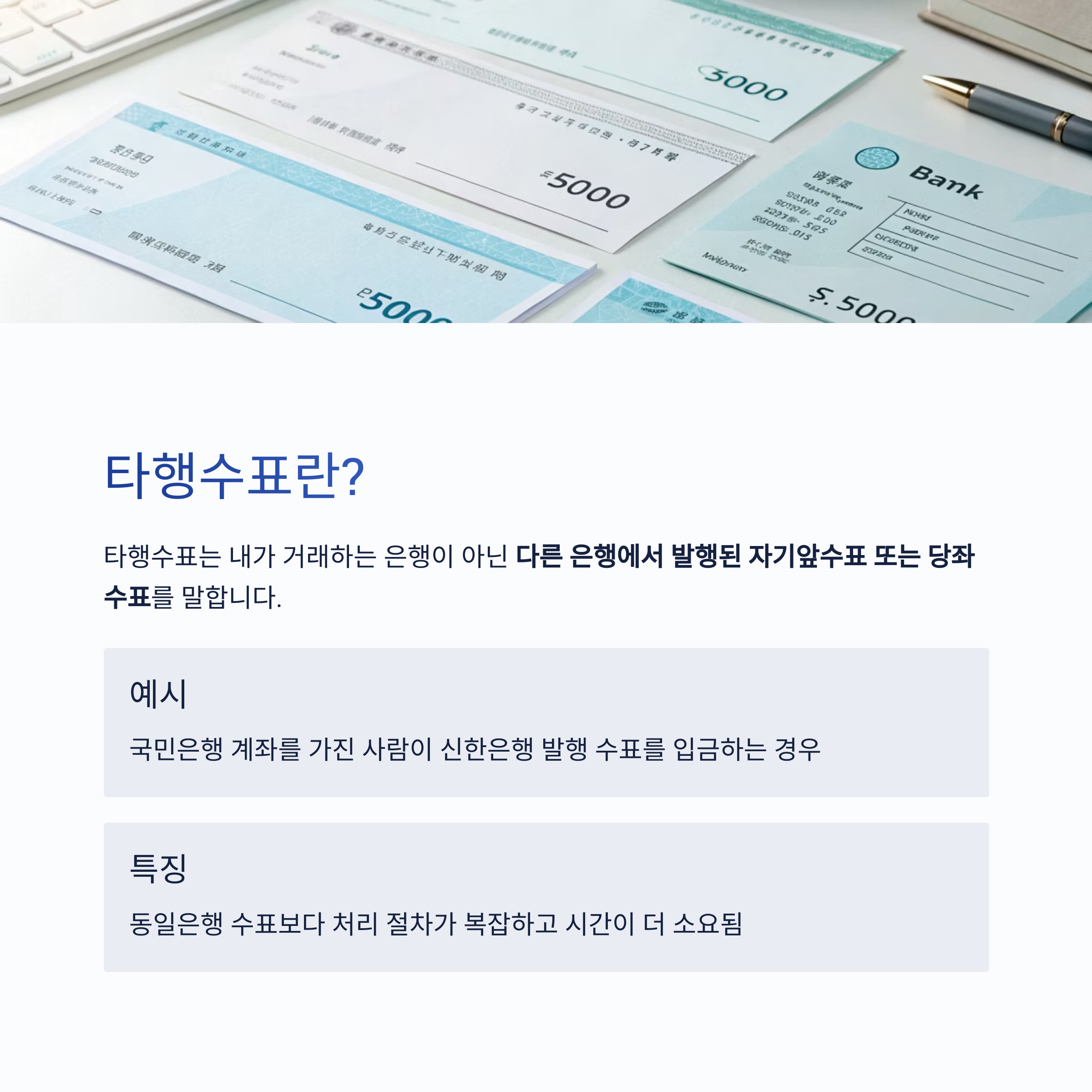 타행수표란 내가 거래하는 은행이 아닌 다른 은행에서 발행된 자기앞수표 또는 당좌수표를 말합니다. 예를 들어, 국민은행 계좌를 가진 사람이 신한은행에서 발행된 수표를 입금하는 경우가 이에 해당합니다. 타행수표는 동일은행 수표보다 처리 절차가 더 복잡하고 시간이 더 소요될 수 있습니다.