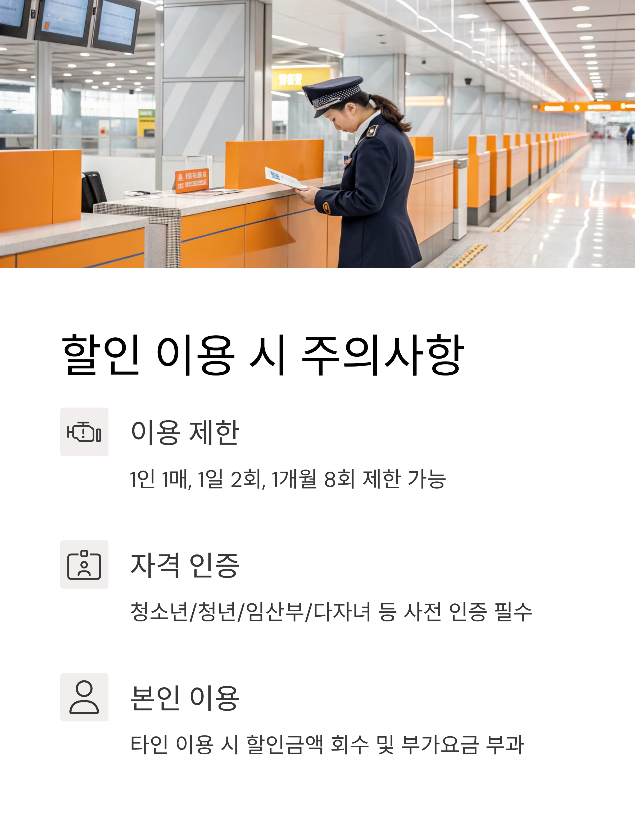 - 할인승차권은 본인만 이용 가능, 타인 이용 시 할인금액 회수 및 부가요금 부과