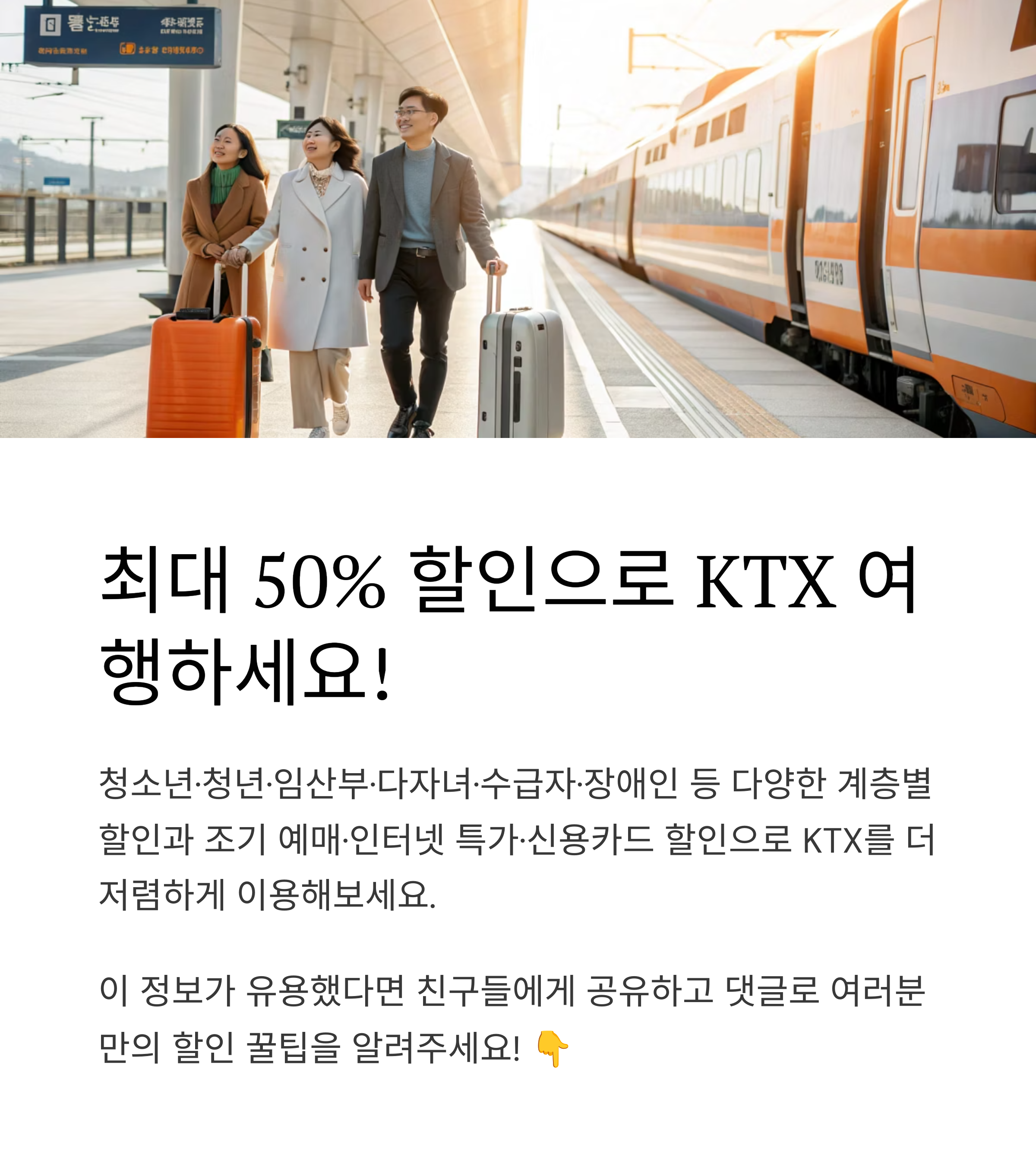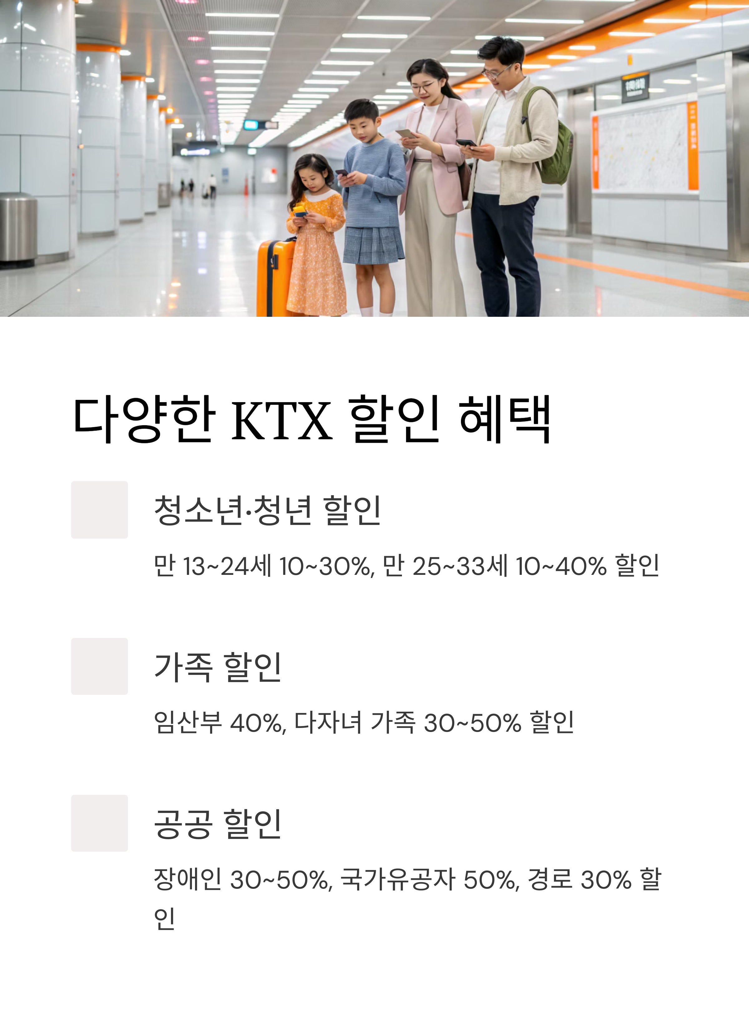 2025년 KTX는 청소년·청년·임산부·다자녀·수급자·장애인 등 다양한 계층별 할인, 조기 예매·인터넷 특가·신용카드 할인 등으로 최대 50%까지 요금 절감이 가능합니다