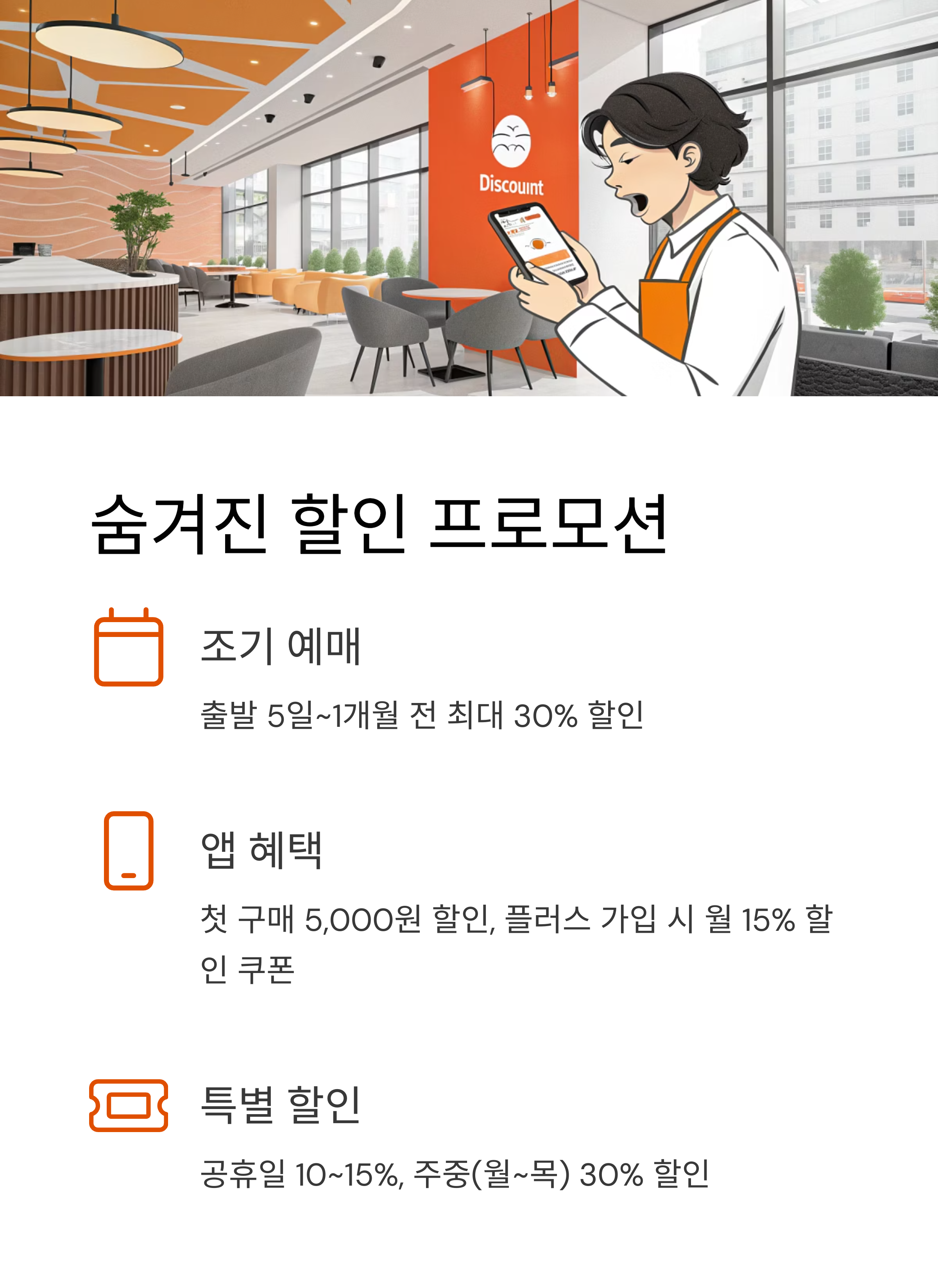 - 조기 예매 할인: 출발 5일~1개월 전 예매 시 최대 30% 할인(좌석 상황에 따라 변동)